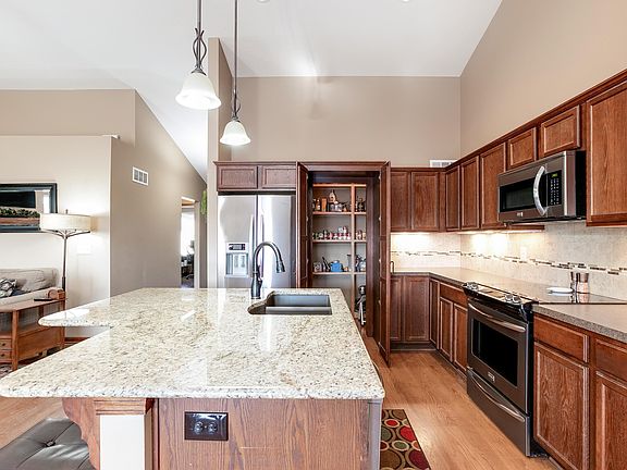Lovely patio home tucked away in a cul-de-sac! Zero entry into an open floor plan with vaulted ceilings and large doorways on the main floor. Master bedroom has an en suite with large walk in closet, tile shower with bench seat, double sinks, private toilet area and pocket doors. Kitchen area has a secret walk in pantry, granite counter tops and stainless steel appliances. Laundry is on the main floor. The view-out basement is finished with two bedrooms and full bath along with a storage area. Out back is a beautiful covered deck to enjoy the evenings and fully fenced yard with gorgeous landscaping.