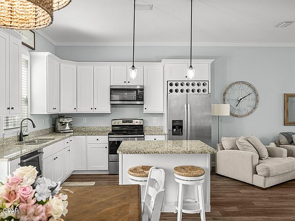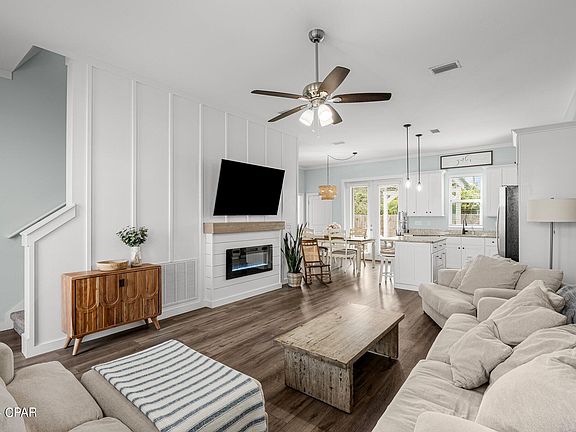 This adorable house is truly a home SWEET home! With upgraded features and tasteful accent walls, you can't help but feel warm and fuzzy as you walk through. The main floor is a great space for entertainment with an open kitchen and good flow to the back patio. If you prefer a quiet night in, the electric fireplace is ideal for ambiance and with 10 foot ceilings you won't feel cramped. The bonus room is also downstairs. It has a good-sized closet and could be used as an office, playroom, gym or wall it off for a 4th bedroom and quick added value! There's already a full bath positioned right next to it. Why do we like 2 story homes? The second floor offers privacy away from guests! The primary bedroom is like a retreat! It's spacious, bright, and has a private balcony. Sit outside and enjoy the morning bird songs in your pjs. It's large enough for your king-sized furniture, has two closets, one being a walk in, and the ensuite offers a soaking tub, separate shower and double vanity. The additional bedrooms have upgraded closets, and one bedroom offers an open closet that can also be utilized as a desk space for homework. If you like low maintenance living, the turf back yard will appeal to you! So instead of tedious lawn work, you can enjoy the covered patio and misting fan while you watch your orange tree bloom. If you don't want to venture down to the beach and bring home sand, the community pool is available instead! Sellers have meticulously maintained this home! There is a brand-new AC unit with a UV air purifier, upgraded laundry room with added cabinets, hurricane boards to protect your windows, metal roof, and a shed for extra storage. Located just off N. Lagoon, this area has quick and convenient access to all the places you want to go, from our white sandy beaches to Pier Park to central Panama City. Measurements approximate, buyer to verify if important.