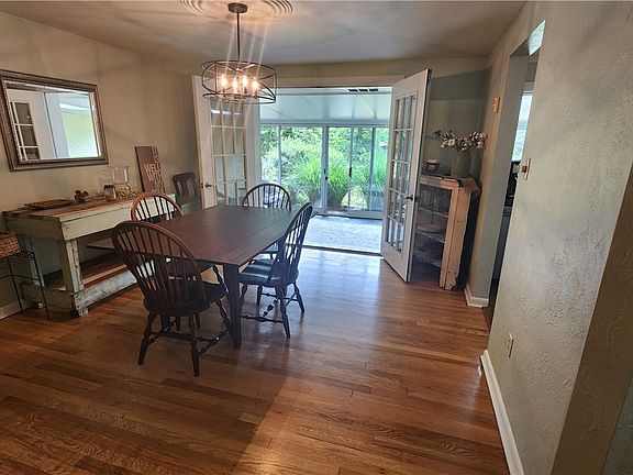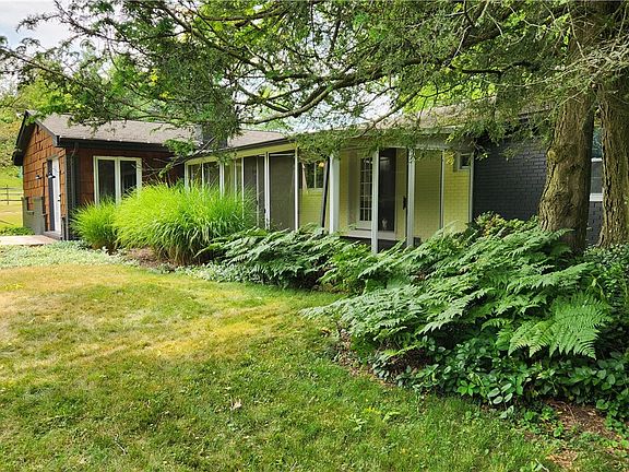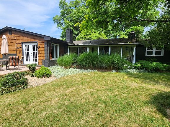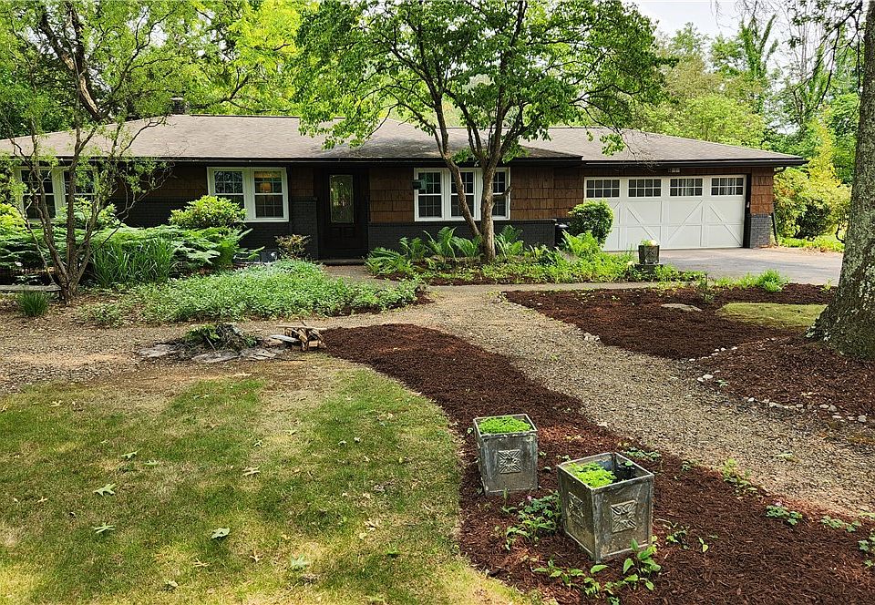 Very spacious, well cared for home in a quiet location. A 'no step' (well one) ranch that sprawls on a level half acre with loads of perennials and majestic trees! Stroll on the paths of the front yard, passed the small pond, and into the front door, where you are greeted with hardwood floors, a view of the living room and dining room, and French doors that lead to the large sun room! This is where you can read, work on your computer, or just open all the doors and listen to the wind thru the ferns. Stroll thru the fully equipped kitchen, where there is ample storage and granite countertops to prepare dinner. To the left then is the addition with sunken family room and wood burning fireplace, and next to that, the sizeable primary bedroom and bath with two closets and double bowl sinks. Do NOT forget the massive game room with theatre room, bar area and even small workout area. We will call it industrial farmhouse, you will call it entertainers delight!