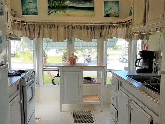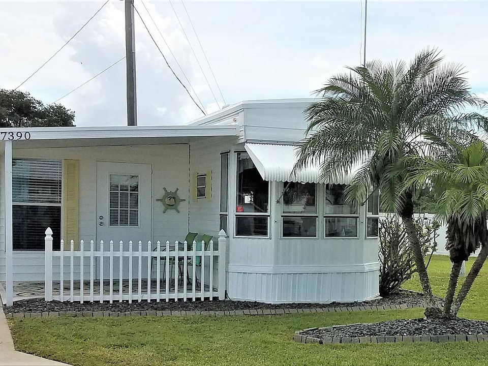 Located on leased land in 55+ community. 1 Bed, 1 Bath fully furnished and beautifully maintained home, insulated Florida Room with Tile floors, glass windows, high-end blinds, partitioned in back with extra bed for guest area. Main home is bright and roomy with nice kitchen area, well done "kick-out" for dining space with beautiful view of the lake and pergola, laminate floors throughout. Roomy bedroom with great closet space and lots of built-ins and very nice bathroom area. LOTS OF EXTRAS HERE - AMS Roof-over, Central A/C with Humidistat and Heat Pump that even extends to the Florida Room, covered Front Patio with Picket Fence, large lot with lovely landscaping, extra storage shed, and HUGE Back Patio with Picket Fence and a removable shade! DON'T WAIT ON THIS ONE!