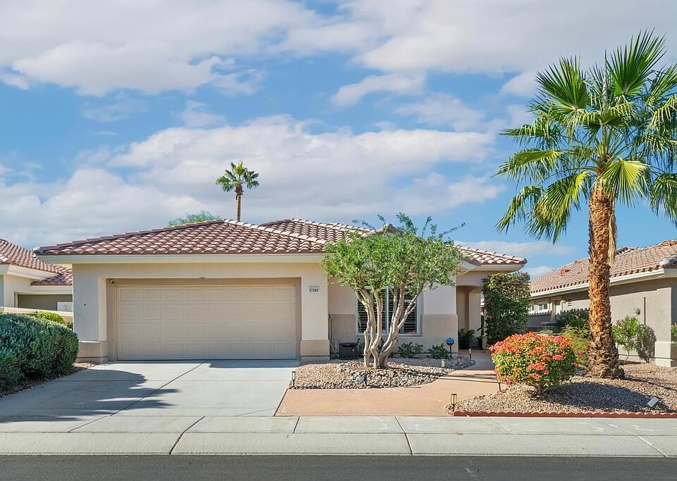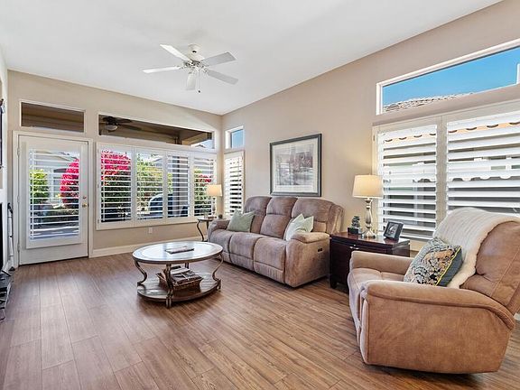 Spectacular Christofle floorplan home in Sun City Palm Desert--move-in ready and ideally located just moments from both the Mountain View and Sunset View clubhouses! This light-filled residence offers abundant natural light throughout, including transom windows, and an inviting living room with media niche and French door opening to the peaceful backyard. The kitchen features Corian countertops, pantry, a convenient pass-through to the living room, and a sliding door to the outdoor living spaces. Step outside to a spacious salt-finished patio surrounded by mature, low-maintenance desert landscaping. An extended Alumawood patio cover with built-in ceiling fan expands your outdoor enjoyment, offering filtered sunshine and year-round comfort. The primary suite features a charming bay window, ensuite bath, and walk-in closet. The primary bathroom includes dual sinks and shower/tub combination. Thoughtful separation places the guest bedroom on the opposite side of the home, ensuring comfort and privacy for both owners and visitors. Additional upgrades include shutters on all windows, LVP or tile flooring throughout, and ceiling fans in nearly every room. The former laundry room has been converted into a versatile service area, with washer and dryer relocated to the garage--offering added interior storage potential. The two-car garage includes built-in cabinetry for extra organization. Whether seeking a carefree lock-and-go seasonal retreat or a comfortable full-time residence, this home is designed for ease of living. Sun City Palm Desert is all about lifestyle! Enjoy remarkably low HOA dues and an incredible array of amenities, including two championship 18-hole golf courses, driving range and practice facilities, pickleball, tennis, softball, bocce ball, and an 18-hole miniature golf course. Additional highlights include an honor library, arts and crafts studios, ballroom, and four pools heated to 87 year-round with spas. Dine at two on-site restaurants, a martini/coffee bar, or the newly renovated indoor/outdoor bar with fire tables--perfect for taking in the views and enjoying the best of desert evenings. Sun City life is vibrant, active, and rich with opportunity--truly one of the valley's most desirable 55+ communities.