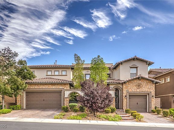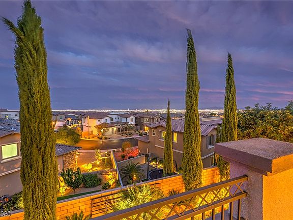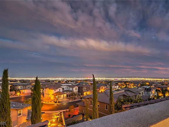 Price improved! This beautifully maintained home delivers unmatched 360° views of the Las Vegas Strip and surrounding mountains—Perched high above the valley, it offers exceptional upgrades and true pride of ownership throughout. A private courtyard with firepit leads to a bright, open great room with dual sliding glass doors that create seamless indoor-outdoor living. The gourmet kitchen features double-stacked cabinetry, custom pantry, large island, designer lighting, and exposed ceiling beams extending to the covered patio with outdoor kitchen and custom in-ground spa. Downstairs includes a full bedroom and bath. Primary suite showcases a stunning custom walk-in closet and spa-like bath. Upstairs, a spacious loft opens to two balconies with panoramic Strip and mountain views. Gated neighborhood just minutes from Downtown Summerlin dining, shopping, parks, trails, City National Arena & the Ballpark. Zoned for one of the best schools in the Valley "Vassiliades Elementary"
