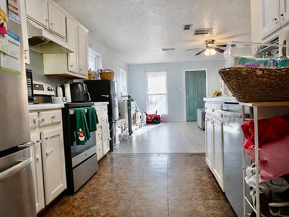 Three-bedroom, two-bathroom single-family residence situated on 9.39 AG-EXEMPT acres, offering a combination of open pasture and mature trees. The home features a functional floor plan with a galley-style kitchen and a spacious living room, providing comfortable everyday living and flexibility. The home is set back on the acreage, allowing for a private and secluded setting.