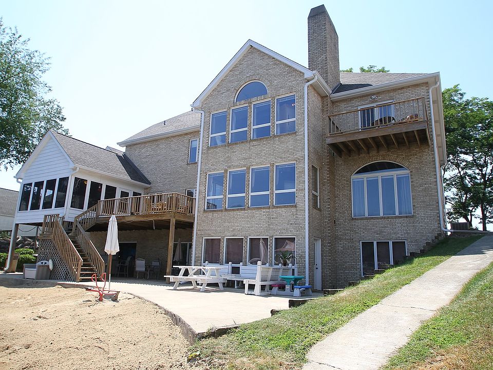Lake living at it's best. Gorgeous all brick home on a peninsula with great water views from all windows. Beautifully crafted 2x6 custom built residence has 136 ft of lake front. Concrete boat ramp and very gradually sloping sandy beach with trucked-in sand. Step into the 2sty. foyer with Brazilian cherry floors and an artfully curved staircase.The hdw.flrs continue into the dining room and the open concept updated kitchen and breakfast area.The rec. room has built-ins, new carpeting and there is a step down living room. Main fl. spacious guest room with bath which is also open to foyer. There is a screened porch to watch sunrises, a 3/4 bath & 2nd. staircase. The master suite has a loft sitting area, another sitting rm., deck and luxurious bath.3 more bd.rooms and 2 bths. & 3rd fl. playroom/bd.room. The newly renovated walk-out basement with 7th bd.room,rec.rm.etc.is great for an in-law suite. Steel dbl. doors open to beach also help to make it the perfect place for staycationing.