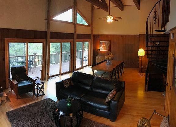 Vintage style lake house near Center Hill Marina. New roof, Soaring open beamed ceilings,Hardwood floors,Updated Anderson windows and doors, Open floor plan with sleeping loft, huge wrap around deck, a two car garage. All on an extra large lot with fire pit.Located directly across from gated section of Center Hill Marina.