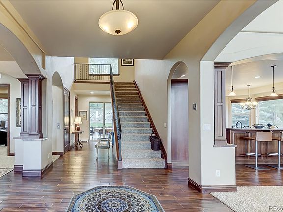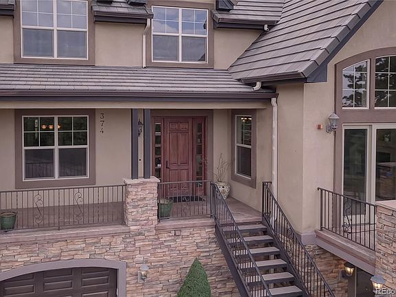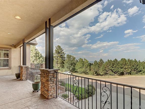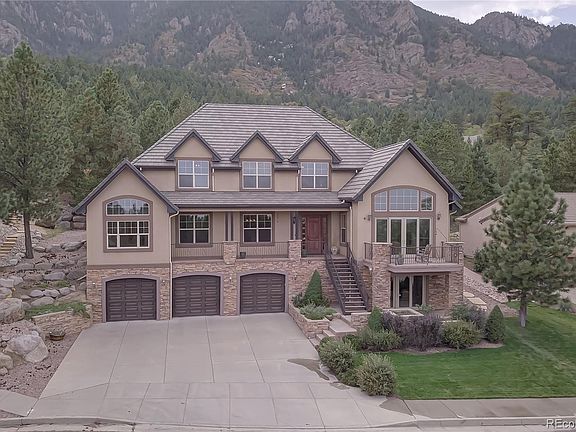 Truly amazing views of Cheyenne Mountain and unobstructed sunrise in this custom high-end open concept home located at the base of the mountain. Several features which inspire this comfort living at the base of the mountains start on the exterior with beautiful mature landscaping surrounding the house. The quality of construction and attention to detail and extras are found throughout. Multiple maintenance free decks including several covered areas to enjoy the beauty and views of the neighborhood outside as well as through the many windows in every room. Interior features include elevator access to all floors that requires no steps entrance from garage, a walk out basement with an exquisite walk behind wet bar, with 9' ceilings throughout adjoining rooms with vaulted ceilings, 5 car oversized heated garage, automatic fire system and security alarm. The well designed kitchen includes stainless steel appliances including double oven, separate island with gas cook top, and multiple seating areas which include the dining nook in kitchen, at the bar island between kitchen and living room, or in the formal dining room which is accented with recessed ceiling. Enjoy working from the main level office which has stone accent walls and built in bookshelves and cabinets. The Master bedroom is a soothing retreat that includes walk around fireplace with sitting area, large attached bathroom with radiant floor heating, a jetted tub as well as a full walk in shower, double vanities, and a large walk in closet. The upper level has a large Jack and Jill bathroom with double vanities separating two large bedrooms that have views of the city. Two additional bedrooms are also located upstairs.