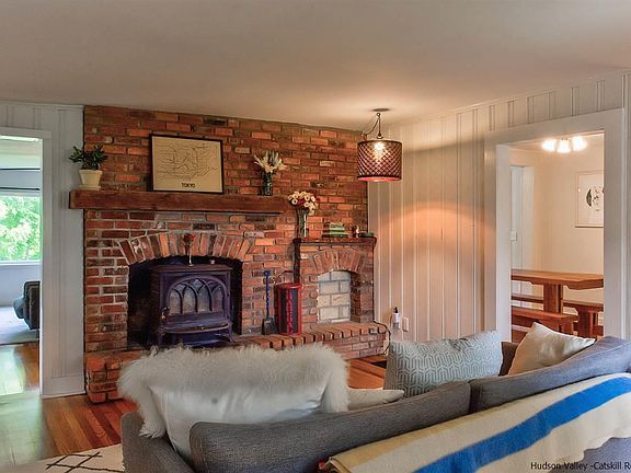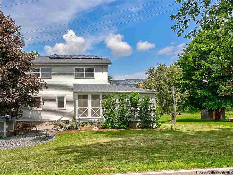 Living is easy in this impressive, generously spacious 4 bedroom, 2 bathroom modern farmhouse with jaw dropping panoramic views of the Shawangunk Ridge. Set on 5.2 level acres, this 2,114 sq ft farmhouse evokes feelings of warmth and comfort in a way that makes you want to put your feet up and stay awhile. Comfy, cozy, and full of charm, the home features sun-drenched living spaces with clean, modern lines. Enjoy Summer days on the front screened-in porch overlooking the gorgeous vineyard of one of the Hudson Valley's best local wineries. Continue into the home through the spacious living room with gleaming hard wood floors, wood-burning insert with a brick surround and solid wood-beam mantel. The living room flows nicely into the gorgeous dining room, where you will enjoy meals while the sun sets beautifully over the Ridge. The kitchen retains the original charm of the house, yet with updates to the counter-tops and appliances. The family room/media room also features an original brick accent wall with generous space and more large windows with mountain views. The ground floor also features a first floor bedroom and full bathroom with washer/dryer. The second floor features a fabulously appointed master bedroom facing the rambling mountain views, a second full bathroom with standing shower and two additional bedrooms. The basement is full and ideal for storage or a workshop also featuring a detached shed. The land here is ideal for living and playing, with an existing chicken coop for your home-grown fresh eggs. If you love the outdoors and are looking to be close to the Ridge, this is home.