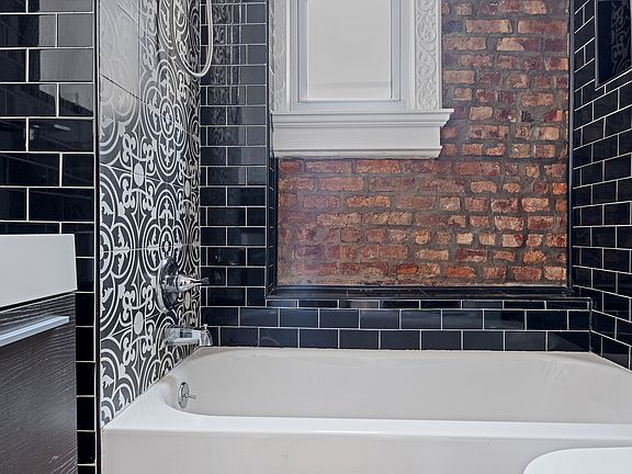 This thoughtfully renovated second-floor walkup blends historic charm with modern convenience. Oversized windows flood the home with natural light, highlighting the beautifully refinished parquet floors and classic wall moldings. The kitchen is a true centerpiece, featuring stainless steel appliances, sleek cabinetry, and striking patterned tilework that complements the exposed brick detail.