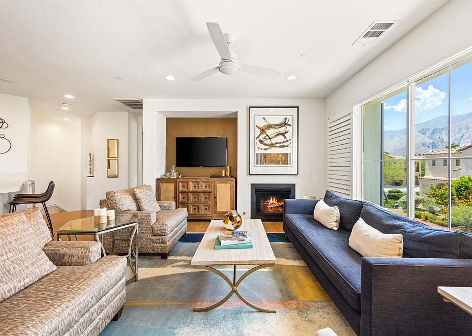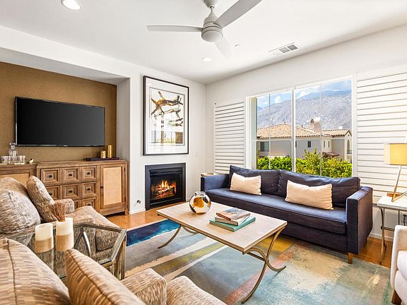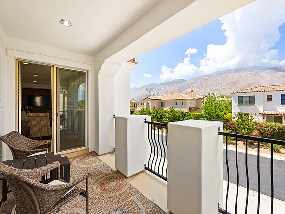 Revel in incredible mountain views from every room in this carriage house floor plan in the gated community of Terra Vita. This fully furnished 2-bedroom, 2-bathroom condo was built in 2013 and has a generous primary bedroom suite with amazing mountain views and an ensuite bathroom. The guest bedroom, thoughtfully separated from the primary suite, is adjacent to the second full bathroom and opens to a spacious balcony for glorious mountain gazing. This property is immaculate with wood-plank tile flooring in the great room & kitchen, plantation shutters, a gas fireplace in the living area, tiled kitchen backsplash and a newer Jenn Air stove/ oven. There is a separate laundry room off the kitchen and a two-car garage with an epoxy finish. This lovely property can be enjoyed as a primary residence, second home or luxury rental. It's just a short walk to the community pool and spa. The Terra Vita Community has well-manicured landscaping throughout and is perfectly located close to downtown Palm Springs for shopping, restaurants and all that Palm Springs has to offer.
