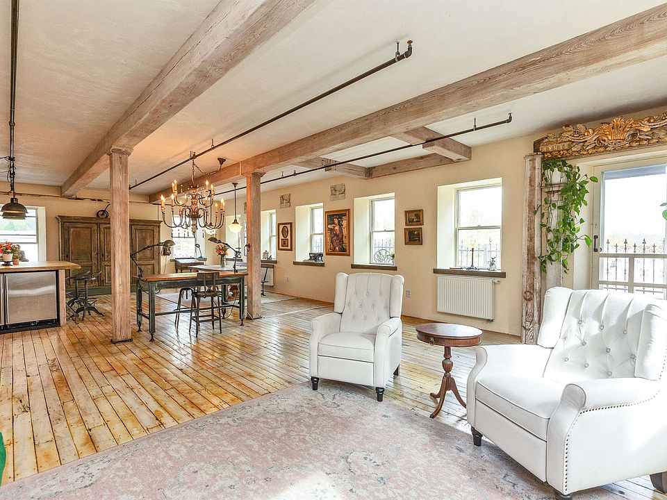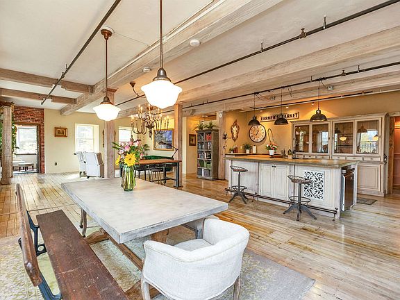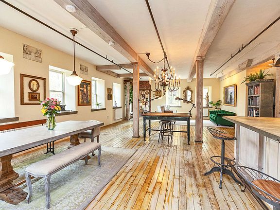 With a Great-room of nearly 1000 sq ft. this space is Perfect for living and entertaining. New price of $495,000! Seller is including a 1-year home warranty for the buyer and will prepay 6 months of condo dues at closing. MORE LIFE, LESS CHORES! One Monthly Payment, Almost Everything Included....heat, hot water, internet, water, sewer, trash, snow removal, landscaping, pest control, and master insurance, predictable costs with no surprise bills. Featured in Country Living magazine, this second-story loft, created by New Hampshire artist and chef Dan Thibeault, is a true one-of-a-kind. Set in a renovated riverside mill in Peterborough, the 1,614 sq ft, 2-bedroom residence blends drama and warmth: soaring ceilings with exposed beams, an oversized kitchen island with seating, a formal dining area, and a generous living space. Transom-topped doorways lead to two bedrooms plus a cozy reading nook/bonus room. A large laundry room adds everyday ease, and the spa-like bath showcases exposed brick and a walk-in shower. Step outside to a trellised, 50-ft balcony, perfect for container gardens and morning coffee overlooking the river. Notable artisan details abound: a gold-leafed archway from France, historic church doors from Belgium, antique pocket doors, a solid marble bath sink, and elevator access. Walk to Adams Playground (pool, tennis, skate park), MacDowell Dam trails, Nature’s Green Grocer, and the shops, dining, and culture of downtown Peterborough.