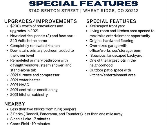 Welcome to this stunning remodeled midcentury home that idyllically elevates timeless style with modern touches on over 10,000 square foot lot. Over $200k worth of renovations and upgrades in 2021 including brand new systems and mechanicals (electrical, plumbing, furnace, water heater, central A/C) and 2024 new roof being installed soon. Roof installation is early in the process so a buyer can select shingle color. SPECIAL FEATURES and FLOORPLAN docs available. The open floorplan allows for a balance of dedicated living spaces and functional flow. Western light illuminates the entrance foyer and living room. The completely renovated large kitchen hosts brand new cabinets, a central eat-in island for ample prep space, and new stainless steel appliances, alongside a dedicated dining nook, built-in bar hutch, and hanging shelving. The main level is rounded out with the stylish 3/4 bath and two bedrooms, both adorned with era-popular wood accents. Exposed brick lines the stairs down to the fully finished basement and the primary bedroom suite's dedicated level. The luxurious 5-piece remodeled primary bathroom features daylight windows, deep soaking tub, steam shower, and extra-long vanity w/ expanded counter space and abundant storage under counter & in disguised medicine cabinets. The primary bedroom walk-in closet was thoughtfully designed for compartmentalization and built-ins for flexible storage needs. Take year-round advantage of one of the largest lots in the neighborhood. The xeriscaped front yard provides low maintenance, while the expansive backyard features a covered patio with retro outdoor kitchen. In addition to entertainment space, the extra large lot creates storage opportunities for outdoor gear with the massive 25'x23' garage adjoined to a 19'x7' office/workshop/storage room and stand-alone 8'x8' shed. Just a quick trip to Tennyson, LoHi, Highlands Square, and Sloan’s Lake, you don't want to miss this opportunity to live at the center of it all.