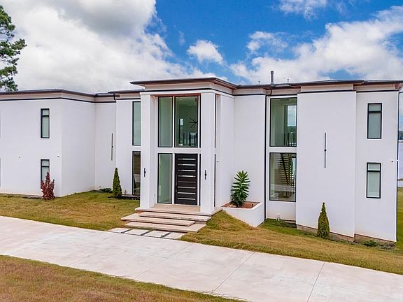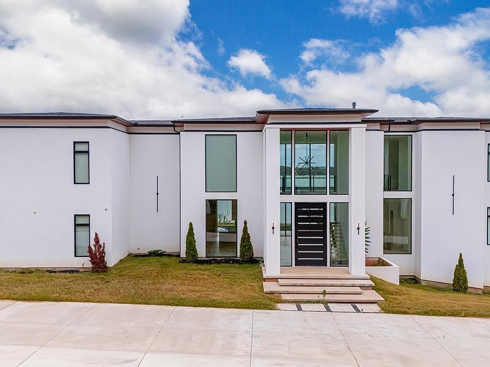 Stunning modern home with floor-to-ceiling glass and panoramic lake views. Open living area with two-story ceilings and dramatic fireplace. Chef's kitchen with premium finishes including Dekton countertops. Floating staircase, pivot doors, clean architectural lines. 25' ceilings in foyer and great room; 12' throughout the rest of the house. Main level features a private primary suite with fireplace & spa bath, upper level sitting room w/ private deck. A guest bedroom and bath is also located on main level. Upper level includes two spacious bedrooms, exercise room overlooking the lake, an office, theatre room and a private indoor golf studio. Finished basement bonus room, tornado shelter. Elevator entry (not installed) available from great room. Fully equipped outdoor kitchen, lighted pool w/waterspouts, circular drive, iron fencing around the front. All situated on a little over an acre lot. True resort style living!