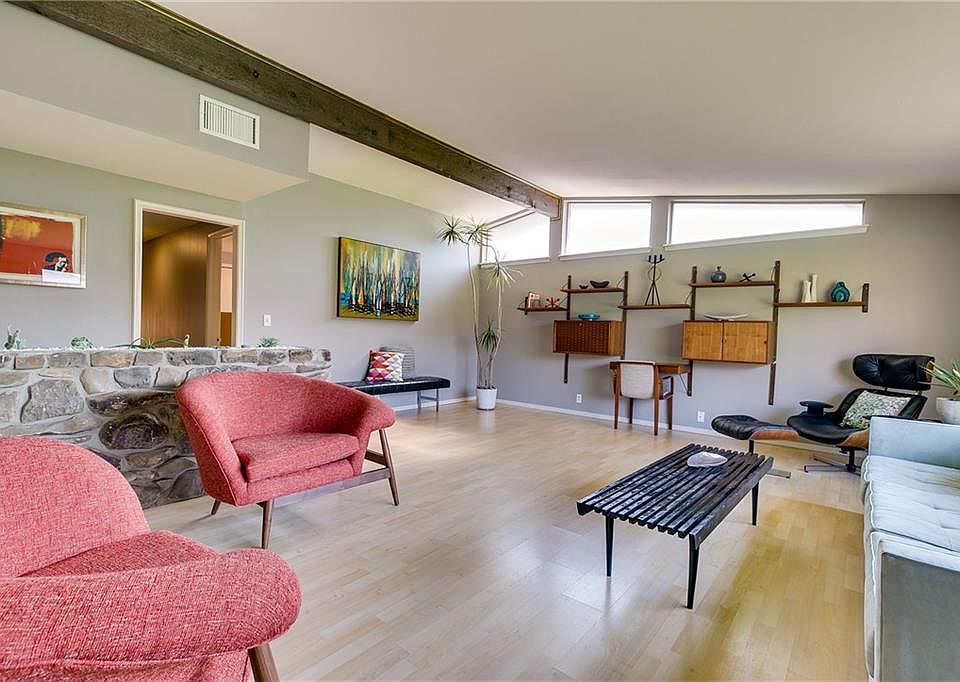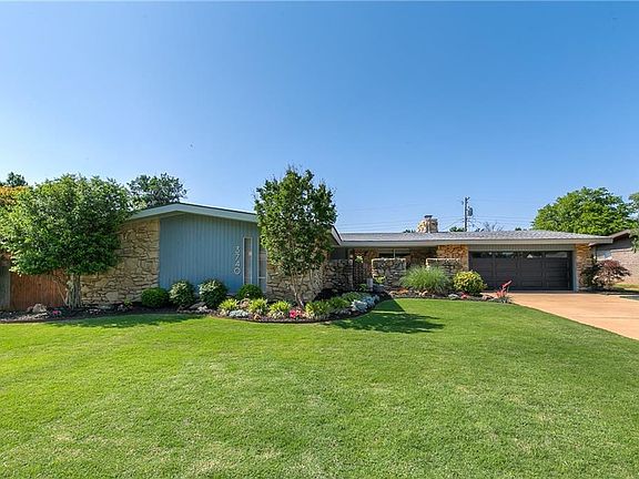 Spectacular stone Mid-century modern home a short walk to lake Hefner trails.The low profile structure with immaculate landscaping, private courtyard, and detailed period iron work is perfect.The stone and paver patio, contemporary mailbox, and iron and stone walls create a wonderful space for morning coffee.The asymmetrical ceilings in the two living rooms with windows above and horizontal beams across the bottom, stone wall planter, and globe pendants carry the style throughout the house showing consistency and balance.The south side of the home has large windows and french doors that lead you to the lush green backyard, and patio with pergola.The kitchen has a eat in space that opens to living and dining. From the kitchen you can see the living room wall covered in stone and anchored with at wood burning fireplace.The Dining room has large windows that look onto the courtyard.The second living with 10 foot ceilings has a vintage teak danish wall unit and stone planter.A rare gem!