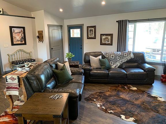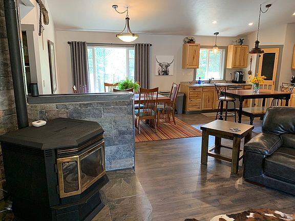 Great sportsman cabin. Plenty of space for trailers, boats, ATV's & more, with wide gravel apron, large two car garage (27'x27'), pass through door, and two additional carports. Room for all the toys! Cute clean two bedroom, two bath home with large open great room and vaulted ceiling. Soothing gray tones throughout the kitchen, living room, dining room and bedrooms. Convenient split bedroom layout with a small bonus room between the home and garage, great for a workout room, office or TV/Gaming room. A/C and two sources of heat with ductless system & pellet stove. 7.72 acres gives you plenty of elbow room to stretch out and allows for an additional shop/guest home. Great location, just minutes away from the Brundage Ski Resort, Lost Valley Reservoir and MeadowCreek Golf Resort.
