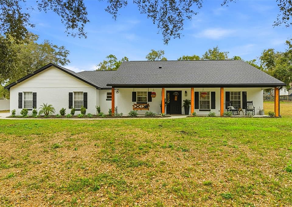 Welcome to this private gated 1.25-acre property in Zephyrhills, FL, offering the perfect combination of space, upgrades, and flexibility. Fully fenced and shaded by beautiful mature oak trees, this 3-bedroom, 2.5-bath home is ideal for buyers searching for land, RV parking, a workshop, and a country lifestyle all with convenient access to town. Inside, the home features a spacious floor plan with a large primary suite and walk-in closet, and a comfortable living area highlighted by a custom electric fireplace. The updated kitchen includes a gas-burning stove, stainless steel appliances, granite countertops, and a modern backsplash making it perfect for everyday living and entertaining. Major upgrades provide peace of mind and long-term value, including a new roof (2022), whole-home water softener (2024), new hardwood floors in both guest bedrooms (2025), and a new double automatic gate opener (2025). The insulated garage with split AC unit offers flexible space for a home gym, workshop, or climate-controlled storage. Outdoor living truly sets this property apart. Enjoy a new expansive paved back patio (2025) with a custom putting green, ideal for entertaining or relaxing outdoors. The extra-long gravel driveway provides ample RV, boat, and trailer parking, while the detached workshop with power, water, and additional covered parking adds exceptional functionality. Conveniently located just north of Zephyrhills with easy access to Wesley Chapel, for shopping, restaurants, and everyday amenities while still delivering the privacy and space buyers are searching for. A rare opportunity to own acreage with upgrades, a gated entrance, RV parking, and a workshop. Don’t miss your chance to make this unique property yours.