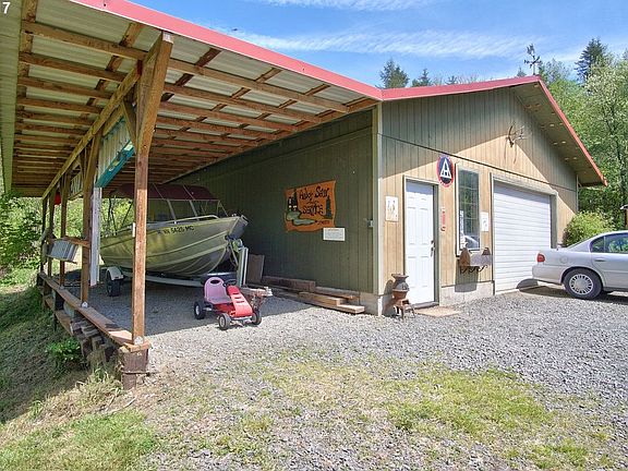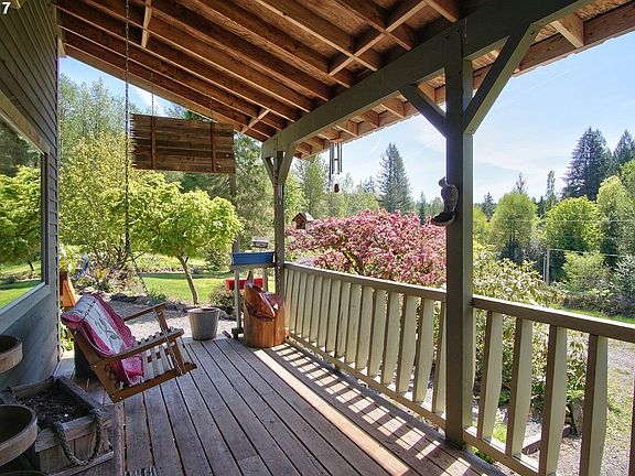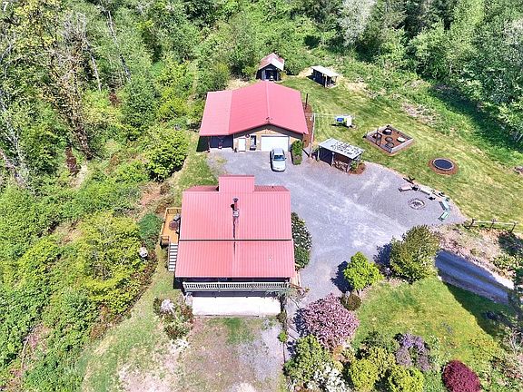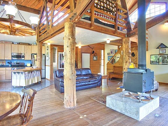 Truly one of a kind custom cabin, built in mid 70's as a church retreat center. Great room had stadium seating for large gatherings. Now a very unique home filled w/character, tall ceilings, big windows, tons of natural light, cozy wood stove & more. Logs from the property accent inside, maple bowling lanes re-purposed for flooring. Lots of upcycling Sits on two acres with large quality built shop, and a creek! Great access to Hwy503.