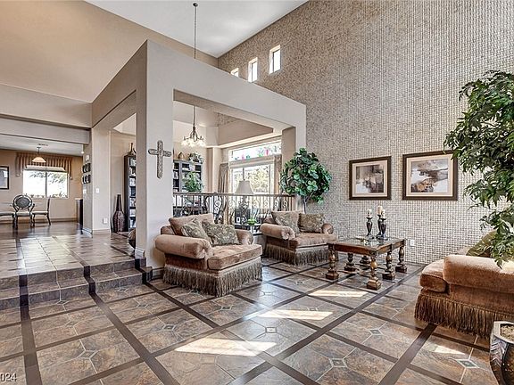 This home is a MUST SEE! Built in Logandale, NV as a model for Southwest Homes, this home has substantial upgrades throughout. Grand entrance includes custom tile and wood flooring, 23 ½ft ceilings, and a feature wall of cut travertine tile. Great Rm continues with custom wood flooring,fireplace, wet bar w/granite countertops and wine fridge. The kitchen is a dream with granite and large center island, under cabinet and toe kick lighting, cooktop and double oven, and plenty of storage. LARGE Primary bedrm has a 10 x 12 sitting rm w/fireplace and balcony, double closets, and primary bath that has a tiled walk in shower, garden tub, dble sinks and make up counter. Second primary bedroom with its own private bathrm. Custom built-ins in both the great rm and primary bedroom. Entire home has custom blinds, and window tinting for increased privacy and energy efficiency. Oversized finished garage is 1024 sq ft w/epoxy painted floor, new garage door opener(2021), Tankless water heater(2019).