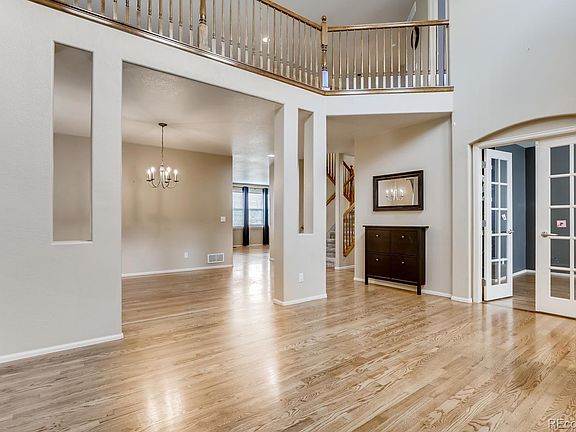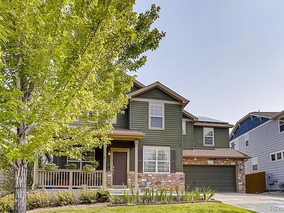 This executive style home welcomes you to a grand living room with 2 story ceilings attached to a formal dining room with solid oak floors, built-in shoe cabinet and mirror included. A private office with glass French doors and built in shelving is perfect for your home office. The kitchen features a slab limestone island, gas range, French door refrigerator, reverse osmosis water system, built-in microwave, concrete countertops, 40 inch cabinets, kitchenaid dishwasher, and eat-in space. Kitchen is open to the family room with a feature stone fireplace. Upstairs you will find a large primary retreat with an attached sitting room, 5 piece bath, and his and hers walk-in closets. A large loft overlooking the living room makes a perfect playroom, schoolroom, office, so many possibilities. 2 secondary bedrooms, a full bath, and a 2nd floor laundry with built-in shelves. Fully finished walk-out basement features a spacious bonus room with a projector screen and 1 bedroom with an attached full bath and walk in closet. Note basement is completely finished just needs new carpet. Yard backs to open space and has many mature trees, beautiful landscaping, berry bushes, and apple trees. Relax on the porch swing, included! Whole house 3 stage water purifier system in basement. Sunrun Solar lease $98.66/month transferred to buyers at closing. Located close to Southlands Mall, a quick drive to DIA or the Tech Center. Award-winning Cherry Creek School District.