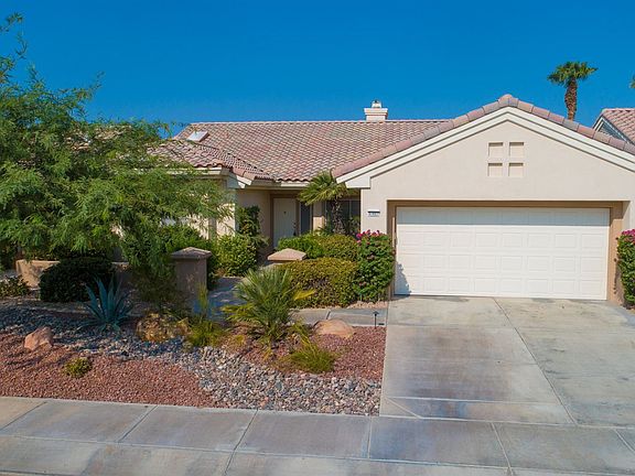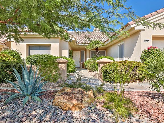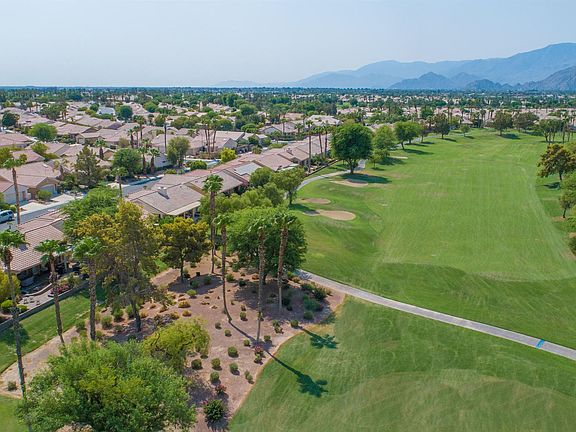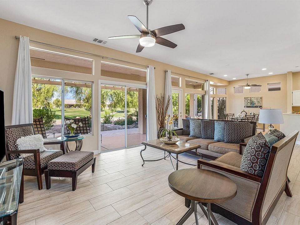 55+ Sun City Palm Desert. Totally upgraded RARE GREAT ROOM Orrefors model (All walls removed b/w living and family rooms.) Gorgeous location on golf course with extended patio, serene, park-like setting and views of the south and west mountains and fairway. Inside, 10 ft. ceilings, ALL NEW Porcelain tile t/o (NO CARPET!), upgraded baseboards, lighting fixtures and fans t/o, interior paint on walls and all woodwork, new 5-burner Whirlpool gas range and microwave/exhaust fan, new cabinet hardware t/o, black-out draperies and more. Outside, Alumawood awning covers the extended rear patio with NEW cool-coat overlay. New UV solar/privacy screens and view screens. Spacious garage has golf cart 'nook', new ''quiet'' opener, swamp cooler with remote. New desert landscaping front and back with new irrigation system and smart controller. Exterior landscape has LED lighting front and back. A/C and water heater are newer. Sun City Palm Desert offers 2 golf courses, 4 swimming pools, tennis and pickleball, 18 hole putting course, Boulevard's restaurant, post office, 70 social clubs, softball field. Home was remodeled and decorated as a forever home and you can move in & enjoy all the benefits.