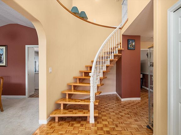 Cathedral ceilingCircular spiral staircaseSs appliancesBi ovenVaulted ceilingFrench doorsRaised sitting area