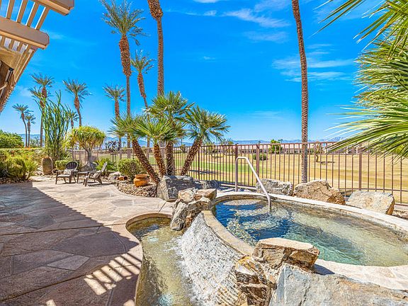 This gorgeous 2 bed, 2.5 bath, upgraded home is located on the 17 fairway at Santa Rosa, in Sun City Palm Desert. The curb appeal is top-notch with beautiful desert landscaping, concrete overlay, tex-cote exterior coating, and a private gated courtyard. As you enter, you'll notice the panoramic golf course and mountain views through the huge, tinted picture windows dressed with Hunter Douglas Pirouette Shades and plantation shutters throughout. The kitchen is open to the living room with a fabulous entertainment system, corner gas fireplace, and formal dining room. It has slab granite counters, rich, custom stained cabinets, stainless appliances, double oven, skylight, and cabinet pull-outs. The primary bedroom has a door out to the yard, double vanity, spa tub, stained cabinets, and walk-in shower and closet with a custom system. The en-suite guest bedroom is private and inviting. The large den/office has double folding doors for a quiet space. The laundry room has a pocket door, cabinets and the washer/dryer stays. Open the sliding door and go out to the awesome fenced backyard with concrete overlay, retractable awning, cool misters, gas built-in BBQ, and that lovely golf course/mountain view. Imagine watching the sunset soaking in this large custom, saltwater, ''Pebbletec'' spa with soothing waterfall. The garage has epoxy floors, recirculating pump, cabinets, and 2 A/C units installed in 2008 and one new compressor in 2014 Some furnishings available outside of escrow