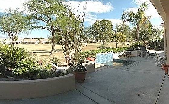 Sun City Palm Desert- Tangier. Enjoy eastern fairway and mountain views from the extended patio which has an in ground spa w/water fall and raised planters w/desert landscaping. A gated courtyard, leaded glass transom window and side panel create curb appeal. Inside, 10' ceilings, transom windows and a wall between the greatroom and kitchen create an open environment. Diagonal tile in all but the den, great and bedrooms. Shutters on most windows. The kitchen has raised panel cabinets, granit...