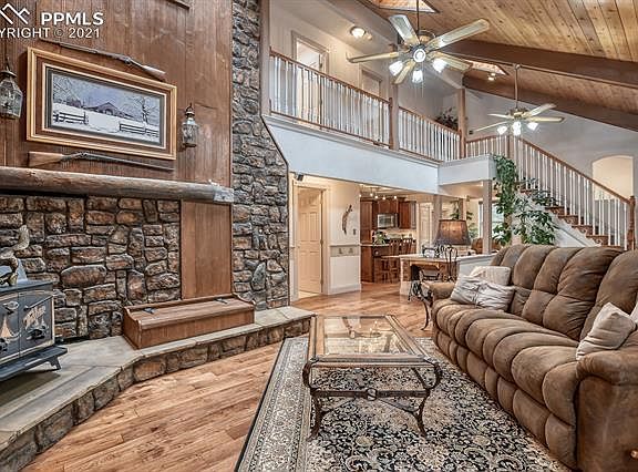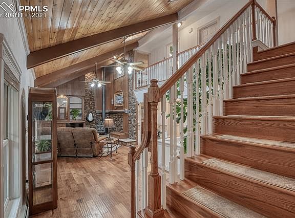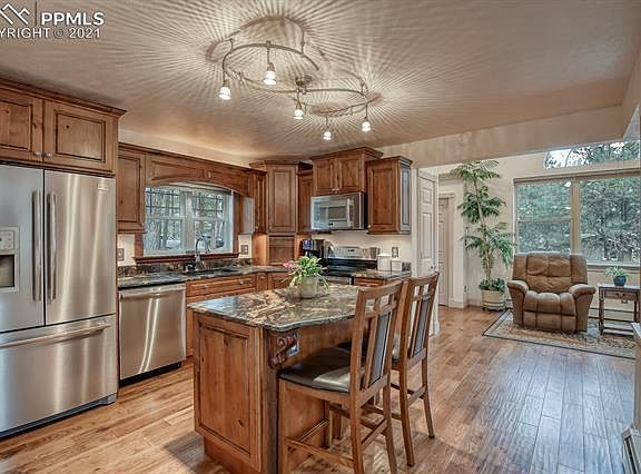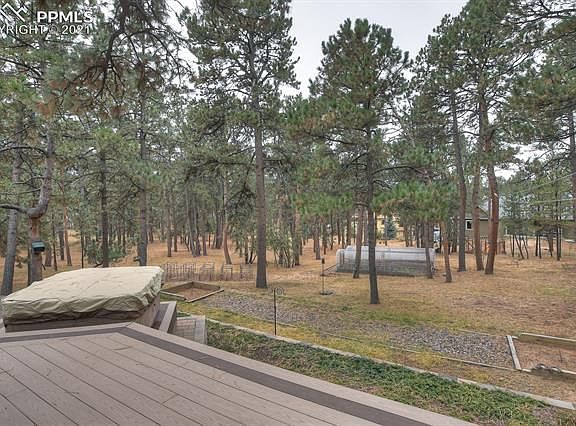 Tucked away on a private 1.24 acres is this one-of-a-kind property that features 3 bedrooms, 3 baths with 2,301 sq ft. and 3-car garage with workshop in the area of Walden III. The two-story entryway/sitting area features a picture window for plenty of natural lighting to bring the outside in. The updated gourmet kitchen boasts granite countertops, custom cabinetry, stainless steel appliance and a center island. Hardwood floors run throughout the main level and into the two-story great room that features a woodstove with stacked stone accent wall, custom built-ins, a tongue and groove wood ceiling with beams and skylights. The eating nook walks-out to the tiered trex deck, a patio with hot tub, the large lot, a horseshoe pit and multiple greenhouses and garden areas. The main floor bedroom with double closet makes a perfect office and completing the main level is a full size bath. Hardwood floors lead to the upper level cat walk that overlooks the great room and the eating nook. Two additional bedrooms and a full size bath with claw foot tub and custom tile complete the upper level. The walk-out lower level features a family room with surround sound, a bath, the laundry room with sink and the washer/dryer stay, and a storage room. Lewis Palmer School District, just a short drive to downtown Monument and near Hwy-83 and the new Monument Academy High School.