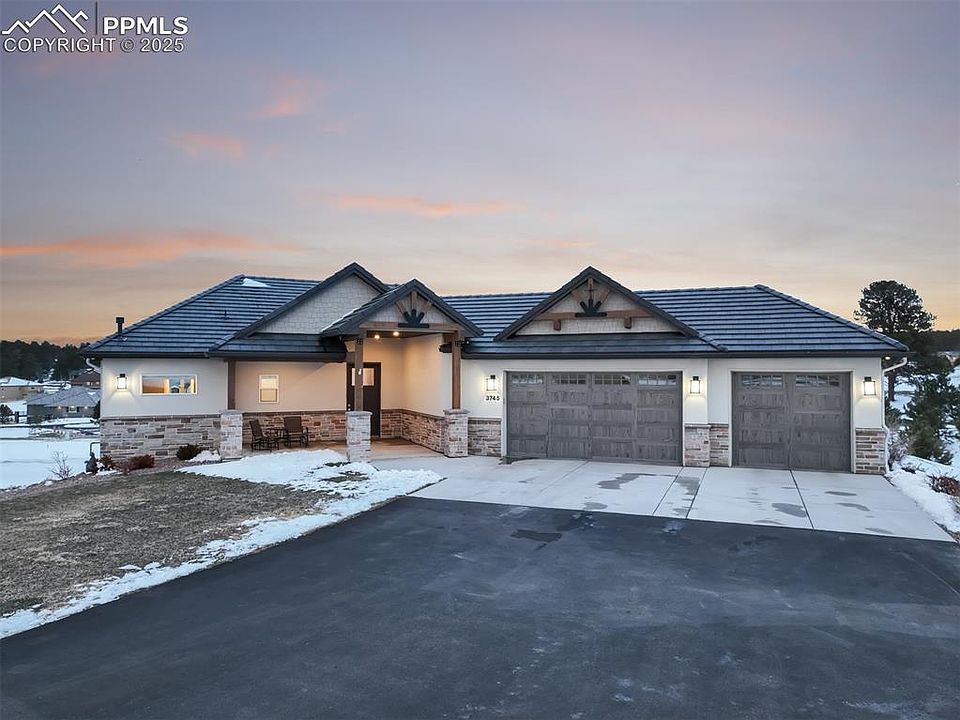 Welcome to this exceptional former Parade of Homes custom ranch-style home in Walden Preserve, offering 3326 ft.² of luxurious living space. Featuring four bedrooms and four bathrooms, this home is designed for main-level living at its finest, with a zero-entry, oversized three-car garage that will delight garage enthusiasts. The garage is fully equipped with a gas line for heating, epoxy flooring, insulation, and a hot and cold water spigot—perfect for all your hobbies and projects. Upon arrival, you are greeted by a beautiful covered front entryway as you make your way into the home, where you’ll be welcomed by stunning wood flooring throughout. The spacious living area boasts tall vaulted ceilings and an abundance of natural light. To the left, you’ll find a powder room, and to the right, a large laundry/mudroom with built-in cabinets, quartz countertops, and a laundry sink, with access to the garage. The heart of the home is the expansive family room with a stone fireplace, large windows that flood the space with natural light, and a door leading to the stunning covered deck. The must-see kitchen features gorgeous leathered granite countertops, a large island, upgraded Bosch appliances, a five-burner gas cooktop with a vent hood, and large farm sink. The spacious dining area also leads out to the large composite deck, perfect for entertaining and year-round use. The primary suite is a retreat with additional access to the back deck. Its luxurious en-suite bath includes beautiful Knotty Alder cabinets, a zero-entry walk-in shower, radiant floor heat, and a custom walk-in closet. The fully finished basement offers a large family/recreation room with walkout access, three additional bedrooms, two full bathrooms, and a sizable storage room. Perfect for multigenerational living, this home sits on 1.14 acres with beautiful views and no neighbors behind. Knotty Alder cabinets throughout add warmth and character to every room, making this home truly exceptional.