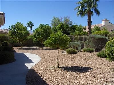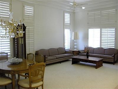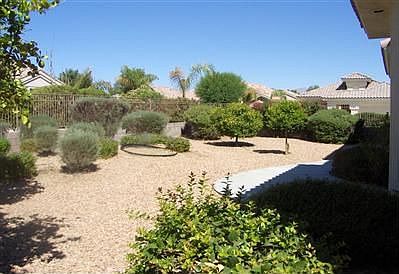 Sun City Palm Desert- Marquis. Located on corner lot, a short distance to Mountain View Clubhouse, Estate model home with a spacious rear yard, extended patio and lush desert landscaping including citrus. A gated courtyard and double door entry provides. Inside, there is a 12 ft coffered ceiling in the living room and foyer (with uplighting). 10ft ceilings are elsewhere. Plantation shutters throughout. The family room has a tile trimmed fireplace and builtin media center. The kitchen has double wall ovens and expansive cabinetry w/pullout shelves and desk unit. A Third bedroom/den/office is off the main hall. A towering skylight and double doors lead to the master suite which has a coffered ceiling, bay window and large walkin closet. The master bath has dual sinks, stall shower and oversize spa tub. A shower/tub is in the guest suite. Laundry room has a utility sink and extensive storage. 2+golf cart garage w/room for abundant storage. This home has central vac and newer a/c.