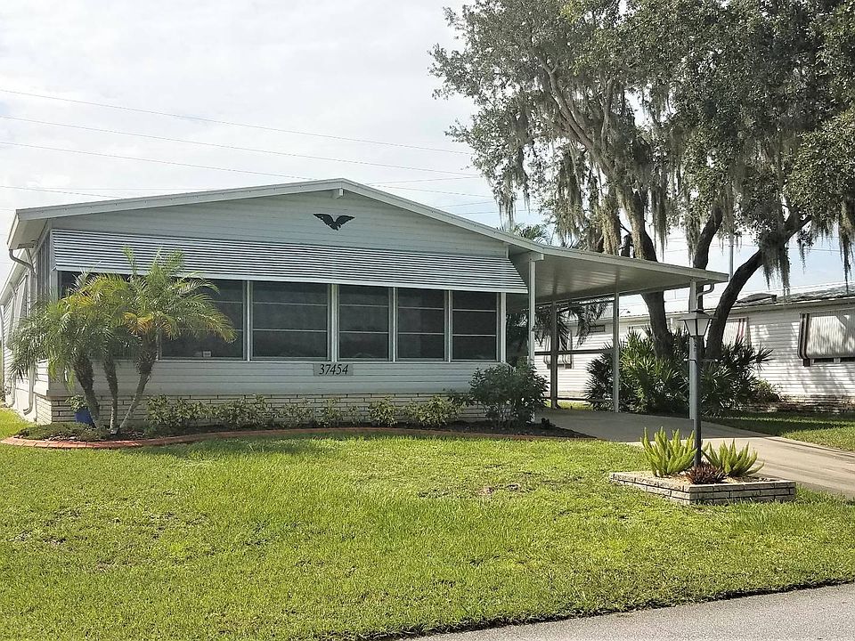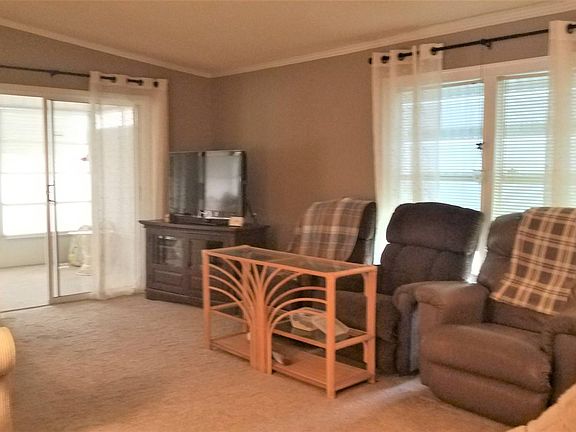 Located on leased land in 55+ community. 2 Bed, 2 Bath Doublewide fully furnished home with HUGE Master Suite; double closets, walk-in shower, new mattresses. Large 2nd bedroom and 2nd full bath in hallway with tub/shower. Large kitchen and dining areas, newer appliances - including dishwasher - and tons of storage throughout. Good sized living room leads to 24 foot long Florida Room! This home has plenty of "extras" - LazyBoy furniture, newer Central A/C with Humidistat and Heat Pump, Metal "Forever" Roof, full size Washer/Dryer in large shed, long attached Carport, and even a dedicated Office! TOUR THIS HOME BEFORE IT'S GONE!