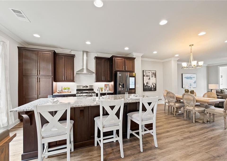 Welcome to this gorgeous, 3 bedroom townhome that is MOVE IN READY! HIGH END FINISHES include upgraded cabinets in the kitchen with pull out drawers, a ceramic farm sink and gas range with vent hood. All appliances remain, including the washer/dryer. This is one of the few townhomes that face the green space, walking trails and has access to plenty of guest parking. Gorgeous wide plank flooring flows seamlessly throughout the main living area and upstairs hallway. You will love the wide open floorplan with the kitchen opening to the dining and family areas. The sunroom is the perfect spot for a home office or reading nook. The primary suite is unbelievable with custom shelving in the closet and the most impressive walk-in shower featuring double rainhead fixtures!! The guest bedroom also features a custom closet and en suite bath. The laundry room is also conveniently located on the 2nd floor. Retreat to the terrace level for a generously sized bedroom and full bath + spacious 2 car garage. You are going love the convenience of Suwanee Station, where you are just a few steps from Fresh Market & restaurants. Come check out the easy life and fall in love with it---WELCOME HOME!