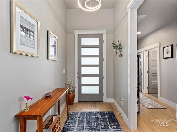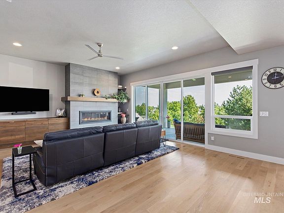 Million dollar views in this Oakwood Estates stunner! Better than new and barely lived in with TONS of upgrades! Seamless flowing floorplan and tons of windows to soak in spectacular sunrises, and enjoy the luxury of a NE facing backyard. Open concept kitchen with Calcutta Venato quartz counters, 36" Fulgor Milano Dual range, Zephyr Pro hood, Frigidaire Pro 64" fridge, wine fridge, and Bosch dishwasher. Check out that Butlers pantry! Living room with custom 50" gas fireplace, built in TV ent with shelving. Luxurious primary suite and en suite featuring dual quartz vanities, stand alone tub & full tile shower. Perfect office space for privacy while working from home. 5" solid oak flooring, motorized window coverings, whole house water filtration and more! Escape your day on your covered patio relishing in your 180 degree view of the Boise Mountains! Largest lot in the sub at .39 acres! Hot tub ready, RV Parking, Sauna, 2 outdoor gas lines, and Tesla charger in your 3 car garage. Too many features to list!