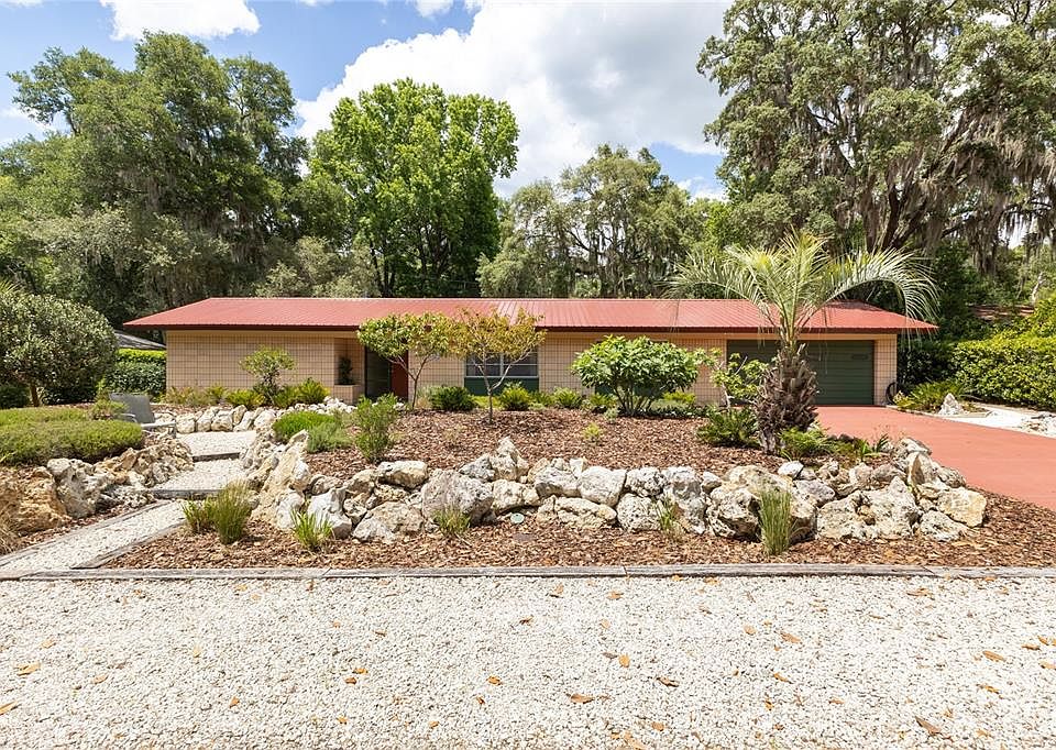 Welcome to this one-of-a-kind Mid-Century Modern Home! This home boasts 4 large bedrooms and 2 baths with over 2300 sq ft of amazing living space. This Dream Home provides aesthetically nostalgic features with modern new conveniences and is nestled in the Anglewood/Sugarfoot community which is less than two miles from the University of Florida, Shands and North Florida hospitals. Built in 1969, this Ocala block home is as solid as a rock! It maintains a contemporary Mid-Century feel which allows for magnificent flows from the outdoor nature areas to the beautiful indoor living spaces. The metal Roof was replaced in 2021 with hurricane tie-downs and code compliant roof decking that results in low home insurance rates. The best news yet is that there is no flood insurance required as the home is not in a flood zone. The HVAC was updated in 2023. This meticulously cared for home has only had two owners! The Original Terrazzo flooring sparkles like diamonds throughout the home. The formal living room looks out onto a beautifully designed and spectacular landscaped green space. The kitchen/family room has a large sliding glass door that leads to the large backyard, bringing in loads of natural light. The beautifully landscaped front yard provides beauty and curb appeal in a park-like setting. The large and fully fenced backyard is perfect for outdoor entertainment and includes a variety of subtropical plants and varieties with beautiful, paved areas that allows for seating options by the fire pit. To top this all off, the oversized two car garage has resurfaced flooring and has additional storage, Enjoy the beautiful nature trails that surround the community for premium dog walks or just to exercise and enjoy nature. There's so much more to explore so schedule your showing today!