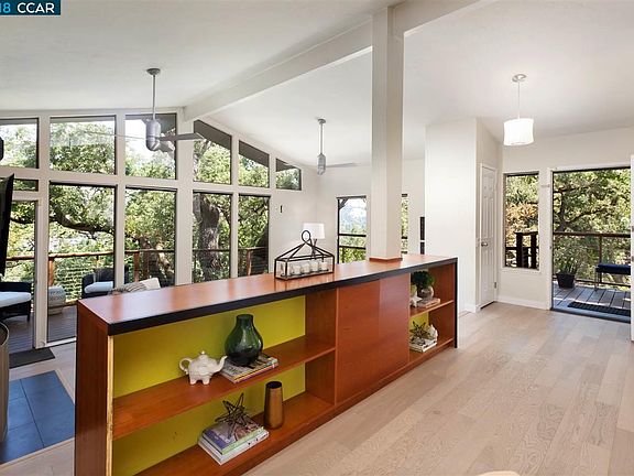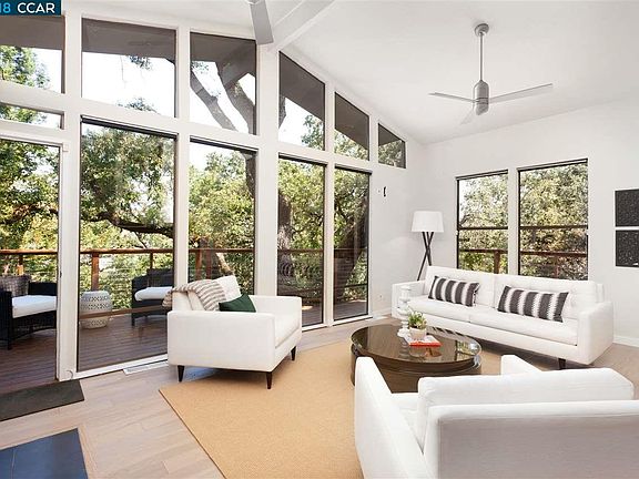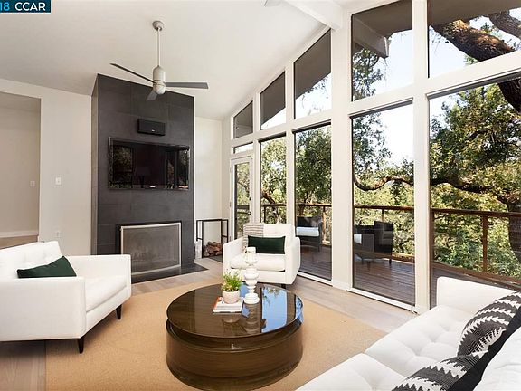 This private and modern 4 BR, 3 BA treehouse is just steps from Lafayette Reservoir and Rim Trail. The home is light and bright with oversized windows that look out on the gorgeous oak trees that surround the property and to Lafayette beyond. The home is contemporary in many ways including an updated kitchen with stainless steel appliances and granite counters and opens to the dining room and living room. The sunken living room is dramatic with vaulted ceilings, tall light flooded windows, wood burning fireplace and updated hardwood floors. Just off the living room is a spacious deck with a commanding view of the property. Back inside, all the bathrooms are updated with modern touches that look ripped from the pages of a design magazine. With 3 BR and 2 BA upstairs the layout is comfortable and thoughtful. The downstairs 1BR/1BA is perfect for guests and has a dramatic walk out deck and treehouse feel. The location is ideal, close to downtown Lafayette, freeway access and BART.
