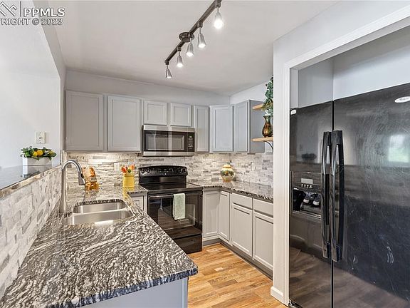 Welcome home to this beautifully updated and fully finished end-unit townhome in the desirable Windjammer Pointe community. With 4 beds, 3 baths, and an attached 1-car garage, this townhome offers both convenience and comfort. Situated close to the Valley Hi public golf course, Ft Carson, downtown Colorado Springs, and I-25, you'll have easy access to all the shopping, dining, and amenities. Plus, you can enjoy a hassle-free lifestyle with all newer wood-laminate flooring throughout—no more worries about carpet maintenance! The kitchen has been tastefully updated with granite countertops, a stylish backsplash, and designer floating shelves, making it a pleasure to cook and entertain. You'll find all kitchen appliances included, making it a move-in-ready dream. The cozy living area features a gas fireplace and built-in shelving, perfect for displaying your favorite decor items or creating a relaxing atmosphere for family and friends. Step outside to your fenced back yard area, ideal for enjoying the outdoors or giving your furry friends a safe space to play. The primary bedroom is generously sized and features a walk-in closet and attached bathroom, providing a private retreat within the townhome. Two additional bedrooms upstairs offer flexibility and convenience, with one of them even featuring an upper walkout deck—a perfect spot for morning coffee or evening relaxation. The basement has been recently finished with a cool industrial look, providing an additional bedroom and bathroom with a shower. You'll also find your laundry space here for added convenience. Rest easy knowing that this townhome comes with central air conditioning, vinyl windows, and a radon mitigation system for peace of mind and comfortable living. And here's a delightful bonus—a bidet is included on each toilet for a touch of luxury and modern convenience. For your guests, extra parking is conveniently located nearby. Don't miss the opportunity to make this townhome your own!