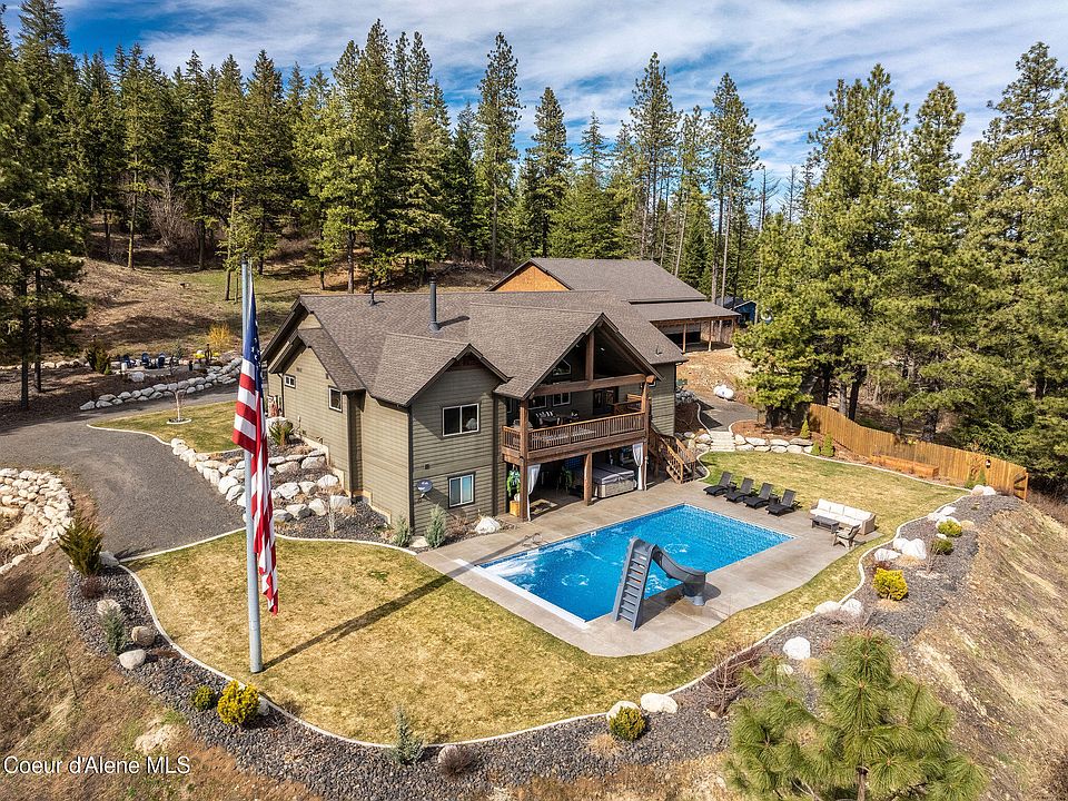 A PERFECT BALANCE OF SECLUSION AND CONVENIENCE! 5/4, 4066 sq ft, 7.18ac, Built in 2019. Discover the perfect blend of luxury and tranquility in this stunning 5-bedroom, 4-bathroom home, offering 4,066 sq ft of thoughtfully designed living space on 7.18 acres. The open-concept main floor features LVP flooring, granite countertops, and a main floor master suite for ultimate comfort. A daylight basement provides additional living space, while the covered Trex composite deck offers breathtaking expansive views. Enjoy outdoor living at its finest with a heated saltwater pool, full landscaping with irrigation, and even a chicken coop. Practical features include a private well, heat tape for winter protection, and a mostly finished 48x60 shop ready for your customization. Just minutes from town, this tastefully upgraded property offers the perfect balance of seclusion and convenience.