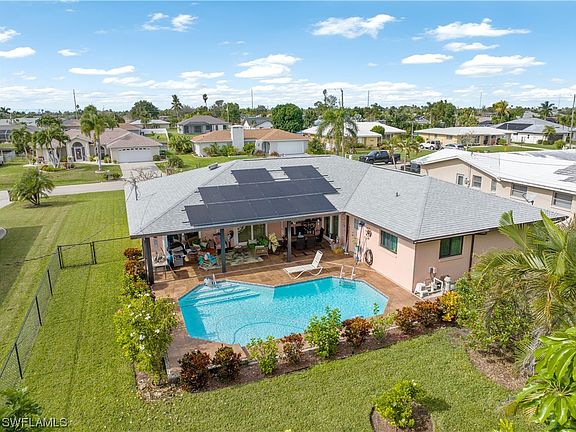 Uncover your perfect haven in Cape Coral! This mid-80s solar powered gem features 3 bedrooms, 2 bathrooms, and a tempting pool for your enjoyment. Impact windows and roll down hurricane shutters as well!! The open layout, filled with natural light, creates an inviting atmosphere. Host effortlessly in the upgraded kitchen and relax in the cozy living spaces. Step outside to your private backyard oasis with a refreshing pool—a daily escape. With its prime location, fresh paint job and timeless appeal, this home effortlessly blends comfort and style. Your Florida lifestyle awaits in this 80s retreat. Welcome home!