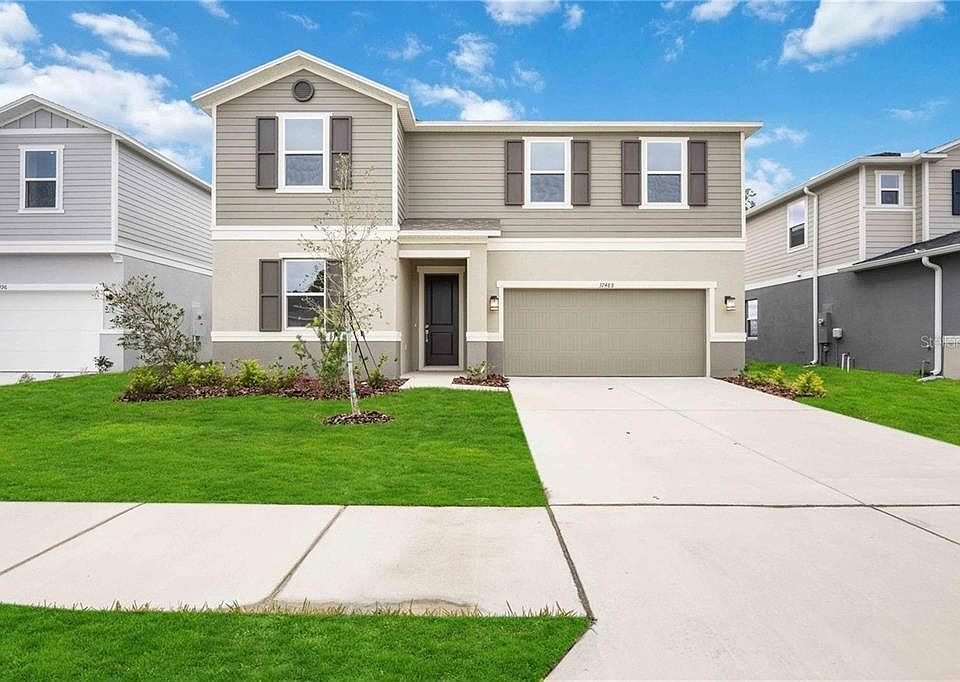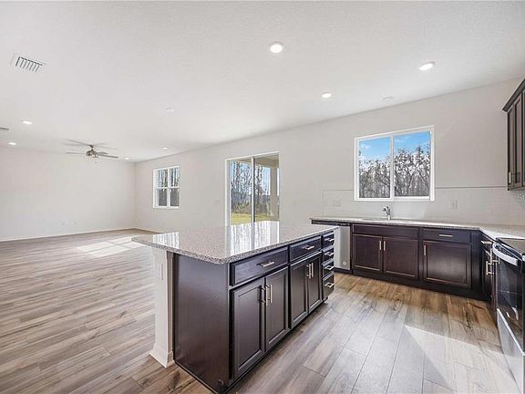 Welcome to your BRAND NEW dream home in the desirable River Run community! This brand-new 5-bedroom, 3-bathroom home offers over 3,000 sq. ft. of thoughtfully designed living space with modern upgrades throughout. Step inside and you'll find a flexible layout with a first-floor bedroom and full bathroom perfect for guests. The heart of the home features an open-concept living area with a spacious great room, dining space, and a show-stopping kitchen. The kitchen includes a large island with bar seating, quartz countertops, stainless steel appliances, walk-in pantry, and light wood cabinetry accented by a marble tile backsplash. An appliance bar and 42-inch upper cabinets with crown molding add extra convenience and style. Upstairs, a large loft separates the primary suite from the secondary bedrooms, offering privacy and functionality. The primary retreat boasts an oversized walk-in closet, ceiling fan, dual-sink vanity with granite countertops, a glass-enclosed shower, and a relaxing garden tub. Each secondary bedroom includes its own walk-in closet, providing ample storage. Enjoy upgraded finishes throughout, including luxury vinyl plank flooring in main living spaces, tile in wet areas, and cozy carpet in the bedrooms. Step outside to your panoramic screened porch with unobstructed preserve views ideal for relaxing or entertaining. The garage features a coated floor for durability and style. Nestled in a peaceful setting yet close to everything this home offers quick access to Hillsborough River State Park, US-301, I-75, State Road 56, the Tampa Premium Outlets, and Wesley Chapel/Zephyrhills medical hubs.