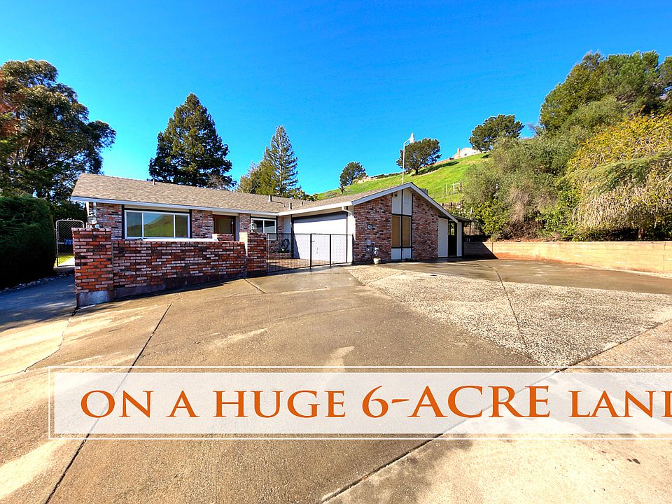 Extremely RARE on a 6-acre lot, charming 3BR, 2BA with LOTS of privacy with upgraded Kitchen, a huge canning station (with vintage gas range/oven) for organic produce (Olives, tomatoes, etc.) from fenced organic garden with lots of fruit bearing trees: Lemon (2), Lime, Tangelo, Oranges (2), Tangerine, Grapefruit, Mandarin, Plums (3), Almond, Peach, Pear, Apples (2). Olives (2), Pomegranate, Prickly Pear Cacktus; huge patio backyard with mature grape vine; huge children's garden play ideal for child day care & Bird Watcher's paradise, huge lot ideal for community garden, a few livestock, summoning Farm to Table restaurant owners. Hugh Young Park is your backyard with panoramic views of the mountain ridges; soak in hot tub overlooking the regional parks and the valley. Lots of possibilities and privacy for this 6-acre RARE Pinole property. (Check with city permit & zoning for land uses).
