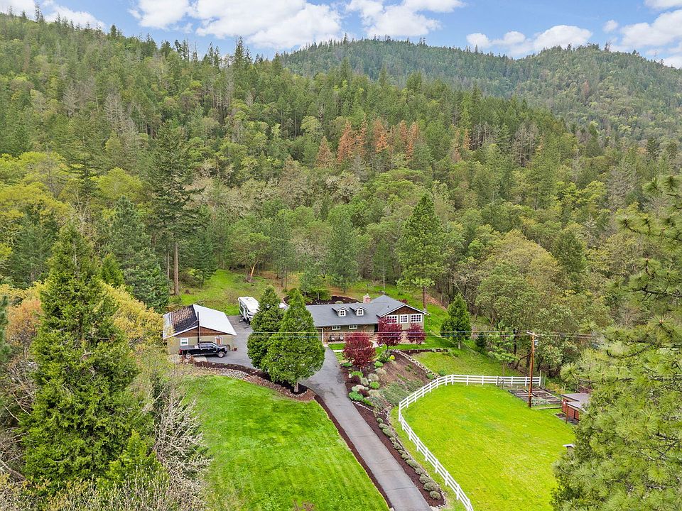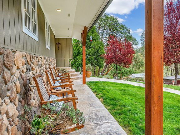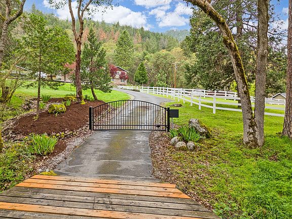 Discover the epitome of Southern Oregon country living on 5.71 acres behind a gated entry. This meticulously updated home feels incredibly cozy and surrounded by so much beauty. This country style home boasts of wonderful amenities including hardwood flooring, newly renovated bathrooms with stunning tiles and fixtures throughout. The open concept living encompasses a large rock fireplace, a beautiful kitchen featuring ample cabinetry, stainless appliances, propane cooking, and a large granite island with eating bar. Relax or entertain in your private back yard space showcasing a large inground pool, outdoor entertaining area with a wet bar, and breathtaking landscaping including a waterfall, koi pond, and for convenience, an outdoor pool house. The property includes a 2-car attached garage + a 5-car detached garage/shop, RV parking, vinyl fencing, small stalls and a paved driveway. Bring your animals and experience the charm of this gated retreat you can call ''HOME''.