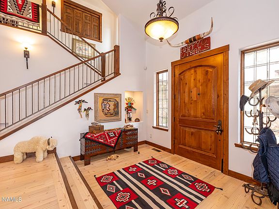 This spacious, Mountain style home is placed to maximize privacy while still enjoying views of the 5th green.It has the much sought after ''mainly'' one level..This is the perfect home to enjoy year around. The patio with fireplace will certainly become a favorite during the summer months.A large Living Room with floor to ceiling Malpais Stone fireplace is open to the Dining Room and Kitchen. Overhead, beautiful wood beams highlight the ceiling. Just next to the Living Room, the Family Room includes a wet bar, refrigerator and ice maker with a wine room and plenty of storage. Another fireplace makes this a perfect extension for entertaining or can be a cozy nest for family movie night.A covered deck is just off the Family Room and sliding glass doors bring in natural Wood floors throughout the main living areas have been completely refinished to a natural tone. Interior steps are artfully delineated with contrasting stain on the edges. The interior of the home was painted in 2019 2020, which greatly enhances the natural light from large windows throughout the home. The home functions as a single level, with one bedroom and bathroom upstairs, perfect for sleep overs for children, or an office. This home features two master large bedroom suites, one off the family room and one near the front of the home that includes a steam shower and heated floor. Take your pick for the primary bedroom! Both enjoy large closets and en suite baths with jetted tubs, separate showers and dual sinks. Patio or deck access from both suites insures your, and your guest's ultimate comfort. Two additional bedrooms, both with en suite baths are on the main level. The powder room is located discretely off the family room. The kitchen features a Wolf gas range, kitchen island, Wolf wall oven and Microwave, 2 dishwashers, custom cabinetry and an eat in option in addition to the breakfast bar and large walk-in pantry. A 3-car garage and driveway with turn around cap the features for this log and chink designed exterior. There is even a large dog run. They really did think of everything with this home! Walking distance to Moorish Station for lunch or cocktails! Solari Bells and Brackets do not convey.