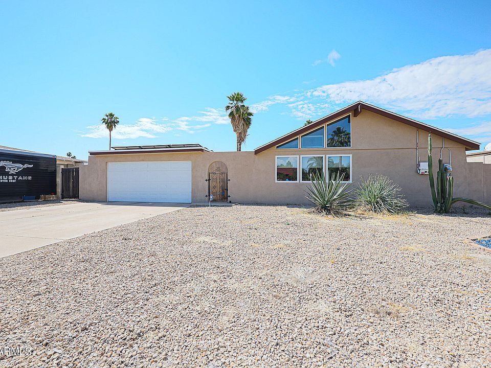Charming 3 bed 2 bath home with unique architecture, centrally located in the North Mountain area! This home features a low maintenance front landscape, 6 car slab parking, RV parking, and a courtyard with water feature. Vaulted ceilings, natural light and neutral tones make this home feel much larger than the stated square footage. Kitchen features granite counters, newer cabinetry, stainless appliances, and a generously sized pantry. Formal eating/entertaining space offers direct access to backyard via French doors. 3 large bedrooms with carpet, master features 3/4 bath and backyard access via French doors and features a small patio. Backyard features a patio, large well maintained pool and blank slate landscaping! NEW AC (2015) DUAL PANE windows. OWNED SOLAR. NEW TANKLESS H20 Heater.