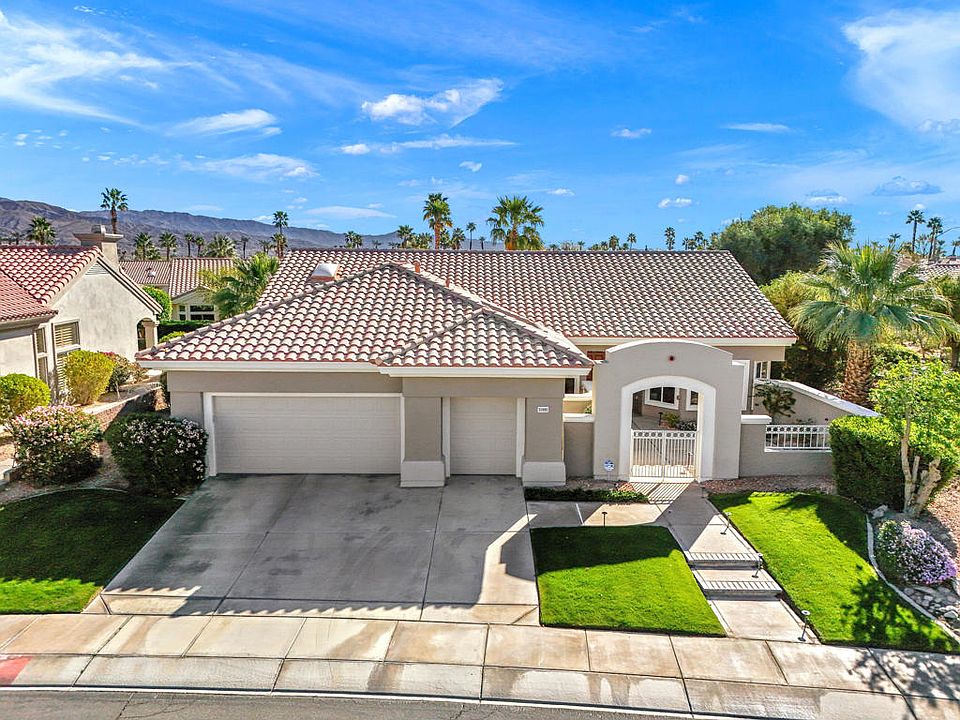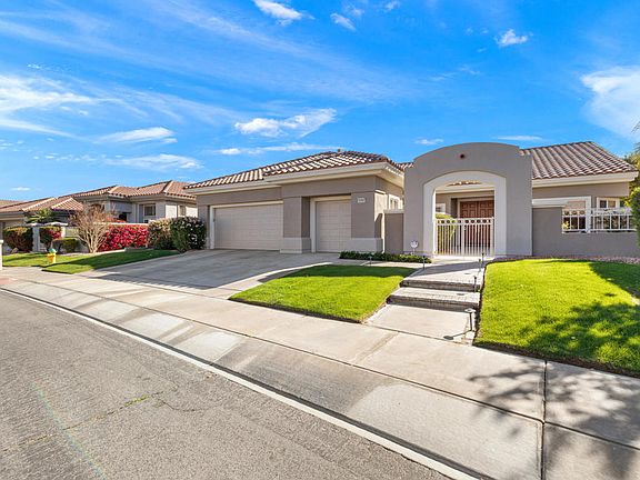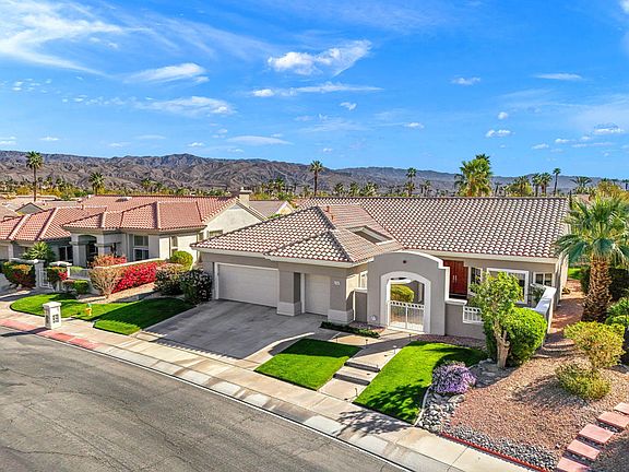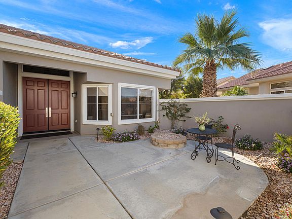 55+ Sun City Palm Desert-The best ''Bang for your Buck'' active retirement lifestyle community filled with an abundance of world class amenities, restaurants, activities including golf, tennis, state-of-the-art fitness facility, pickleball, art and music clubs and many more! Welcome to this super RARE open-concept highly upgraded Solitaire Estate model. This charming contemporary home is nestled in a unique park-like, quaint and peaceful setting with birds serenading you while you relax on your private patio. The beautiful curb appeal with new paint and patio covers, low maintenance landscaping, gated courtyard, extended patio with a quiet area for your morning sunshine and cup of coffee. Inside, double door entry, high coffered ceilings, luxury vinyl flooring, 4.25 in. baseboard, newer paint, upgraded fans, window coverings and solar shades. Living room features stunning custom feature wall with lighting, 78'' Smart TV, electric Dimplex 74'' fireplace setting the tone for relaxing or entertaining. The WOW factor is the brilliantly remodeled kitchen as the wall has been removed between the family room and kitchen opening up to create a spacious great room. The kitchen features quartz counters, new cabinets/fronts/hardware. new stainless appliances, new Blanco sink/disposal and fixtures. Breakfast nook in bay window with slider to the patio. The huge master suite features coffered ceilings, sliding door to to it's own private gated courtyard. The master bath has all the bells and whistles... large skylight, quartz vanity/counter, expanded shower with bench seat, extra linen cabinet, new hardware/fixtures, new lighting, mirrors, medicine cabinets, Toto toilet/bidet, walk-in closet by Garage Butler. Two guest bedrooms, one doubles as an office with a murphy bed, the other has a bay window with views to the lush yard, and the hall bath has a walk-in tub/shower combo. The laundry room has washer and dryer included and a hallway to the attached 2 car garage plus a golf cart garage. The garage features epoxy flooring, 220V outlet for RV, Navien tankless water heater, Heat pump (House furnace/AC), recirc pump, and mini-split AC. The custom landscaping, new watering system/controller, updated fountain, landscape lighting/timers, rocks, sod, and French drain from back patio to the road. Do not miss the opportunity to buy a stunning entertainers home that is all done to the nines! 'Buy Where you Love to Play....Sun City Palm Desert!'
