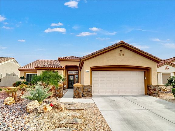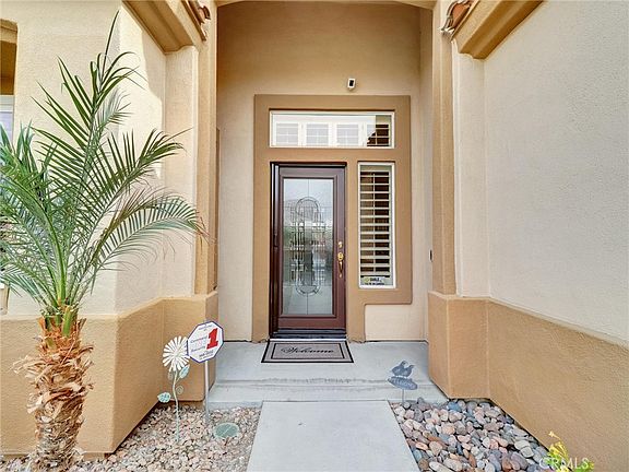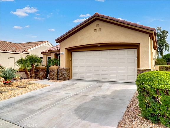 Welcome to paradise at Sun City Palm Desert! This highly upgraded home has been meticulously maintained with high end finishes and modern design. As you enter this beautiful property, you are greeted with custom stacked stone pillars and large courtyard. The leaded glass entry door provides that classic touch and invites you in with warmth and light. You will appreciate the quiet location and shaded backyard on warm afternoons where you can relax and enjoy. For the gourmet cook, they will love the fully renovated and expanded kitchen with custom cabinets, new Kitchen Aid dishwasher, five burner gas stove, quartz counters, custom backsplash, farmhouse sink, soft close cabinets and refrigerator is also included. The most stunning areas of this property is the magnificent custom fireplace! The 10 foot stacked stone encompasses from floor to ceiling with a 100" electric fireplace that functions not only for ambiance but heat if you choose to warm up your space. Custom speakers, surround sound are built into the ceiling, the wall and above the fireplace to provide that theater like affect. Custom built in shelves are nestled on either side of this gorgeous fireplace and two cabinets complete the stunning wall. The entire home has both porcelain and ceramic tile for ease of cleaning, custom shutters in most rooms, ceiling fans, paneled interior doors, many of the windows have been replaced with dual pane vinyl glass. Your large master suite opens into your private bath with custom quartz counters, rectangle sinks, new faucets and custom mirrors, a large walk in closet with custom built organizer featuring drawers and built in hamper. Currently the back bedroom is used for an office with custom built in desk and cabinets. A home facing west provides shade for the backyard and this home is positioned perfectly. The back patio provides cover for outdoor dining and the commercial mister system can help keep you cool on those warm days. Your yard here is totally private and you will enjoy a quick dip in the above ground spa. This low maintenance yard frees up your time to enjoy the any events and activities going on within the community. Club houses, golf, pools, restaurants, pickel ball and the list goes on. The two car oversized garage has a ton of overhead storage, epoxy floors and the built in sink, soft water system, new tankless water heater, ring door bell cameras, 50 amp RV outlet. See attached supplements for list of upgrades/floorplan