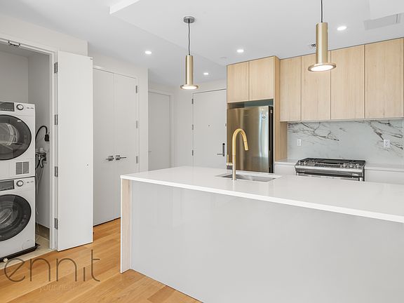 Epitome of luxury Living in this exceptional apartment, Immerse yourself in an abundance of natural light streaming and illuminating the space, highlighting the sleek finishes throughout. The residence has been meticulously designed with a focus on opulence and contemporary style. Adorned with exquisite white oak hardwood floors, the space seamlessly combines elegance and functionality. The kitchen is a chef's dream, featuring top-of-the-line stainless steel appliances, pristine white quartz countertops, and custom kitchen cabinets with modern champagne bronze finishes. The bathroom is a sanctuary of relaxation, equipped with luxurious Grohe fixtures, a mirrored vanity, and an inviting soaking tub. Washer/Dryer in unit. Convenience of keyless electronic access.