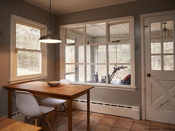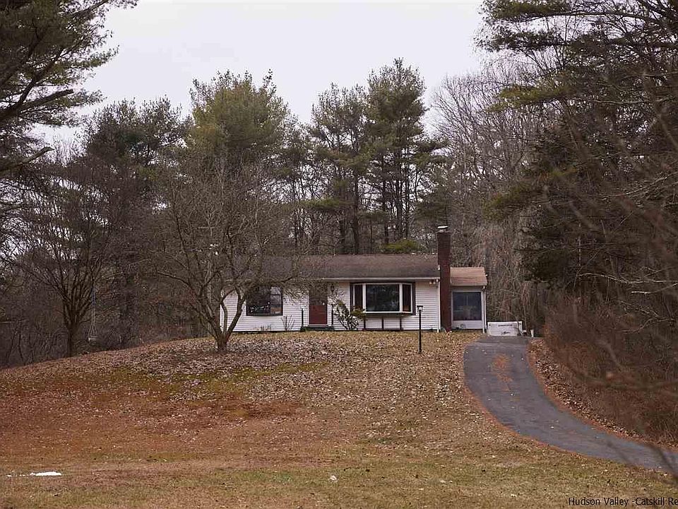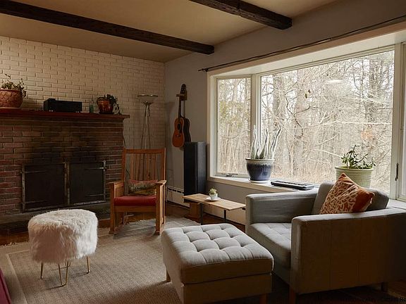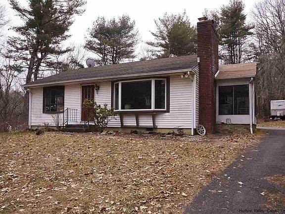 Here is a wonderful opportunity to live simply and surrounded by nature! Set back from the road and situated on 7.3 private wooded acres, this two-bedroom, one-bath mid-century ranch with detached two-car garage has been referred to as The Little House on the Hill. The sprawling front yard is perfect for sledding in the winter and get-togethers in summer. The floor plan is simple, cozy, and provides the perfect backdrop for modern or traditional styling. There are wood and tile floors throughout the home, and large bay windows in the main bedroom, living room, and kitchen, which let in plenty of light and views. The original stone and brick fireplace is the focal point of the living room. Off the kitchen is a bright, enclosed porch with a stone tile floor. Upgrades include a new hot water heater as well as renovations to the 576 sq.ft. two-car garage, which is currently configured as a workshop and music studio. There is the possibility of subdividing the property and creating a separate building lot on a lower-lying, level area adjacent to the main home. In addition to roaming the property's acreage, lined with stone walls, there are several nature preserves with hiking trails located just minutes away: John Burroughs Nature Sanctuary, Shaupeneak Ridge, and Black Creek Preserve on the Hudson River. This perfect location is 10 minutes to the hamlet of Highland and just 15 minutes to New Paltz, Poughkeepsie (with Metro North Station), and Kingston for shopping, restaurants, etc. Call to book a showing today!