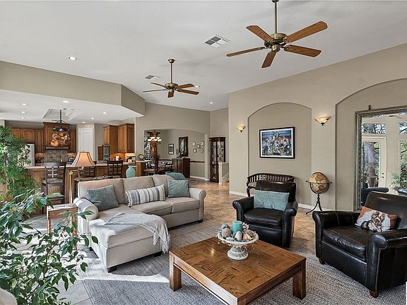 COME and SEE this custom home in the gated community, the Overlook of River Crossing!This amazing home has a large wall of windows,facing east,that give it wonderful light throughout the day and overlooks the 13th and 14th hole on golf course.On the opposite side of the windows is an expansive living room, music/office room, media room and even a breakfast nook which has an elevated view of the #14 tee box to watch those golfers with your morning coffee.Home conveys with golf initiation fee (value 8,500, includes clubhouse, pool and activity center).Media room comes with a wet bar, mini frig and entertainment shelf system. Backyard is an oasis with abundant oaks as well as a unique landscape design that incorporates natural rock formations, granite pathways, a water feature and an 8 ft stained concrete table on patio.Gardners will love the 20x48 ft enclosed raised garden bed complete with irrigation.