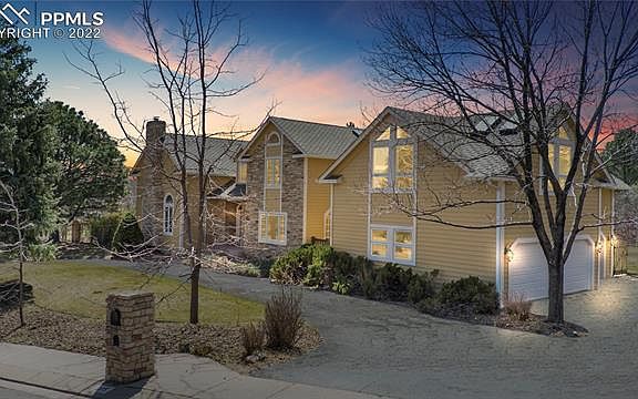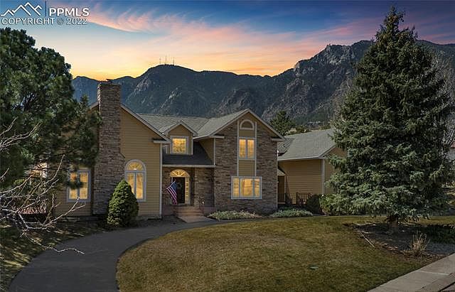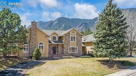 This beautiful home boasts 7,063 square feet and sits on just over 3/4 of an acre with expansive views of Cheyenne Mountain. Upon entry to this beautifully constructed, one owner home, you are greeted by a gorgeous foyer with a grand staircase and vaulted ceilings. The main level consists of a two story library that has crown molding, built-in bookshelves, a fireplace, and hardwood floors throughout. The formal dining room features crown molding, a butlers pantry and walks out to a covered patio. The laundry room features built-in cabinets and a utility sink. The eat-in kitchen includes terracotta-tiled flooring, oak wood cabinets, a built-in desk and a breakfast nook with bay windows that showcase the stunning view of Cheyenne Mountain. The welcoming and spacious living room offers a stone fireplace and conveniently adjoins to the kitchen that includes a walkout to the covered deck that is perfect for entertaining. The main level master suite includes vaulted ceilings, his-and-her bathrooms that offer a jacuzzi tub, Roman shower, gas fireplace, bay sitting window, double walk-in closets and a walk out to the covered deck! Upstairs there is a spacious loft and 2 additional bedrooms with an adjoined bath and separate vanities. The South facing bedroom includes a private deck with sweeping views of Cheyenne Mountain. The walk-out finished basement includes a large family room with a beamed ceiling, gas fireplace, bay window with seating and a wet bar. Additionally, there are two bedrooms with walk-in closets, a vanity, a three-quarter bathroom and two storage rooms with ample space. Located above the three-car garage is a mother-in-law suite that offers plenty of natural light, vaulted ceilings, skylights, an adjoining three-quarter bathroom and a large closet with plenty of storage. This home backs to parkland and a creek offering protection of your fantastic views. Located just minutes to the Broadmoor, CSCC and the award winning Cheyenne Mountain schools!