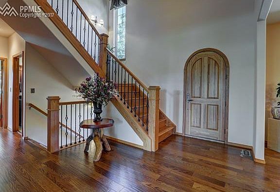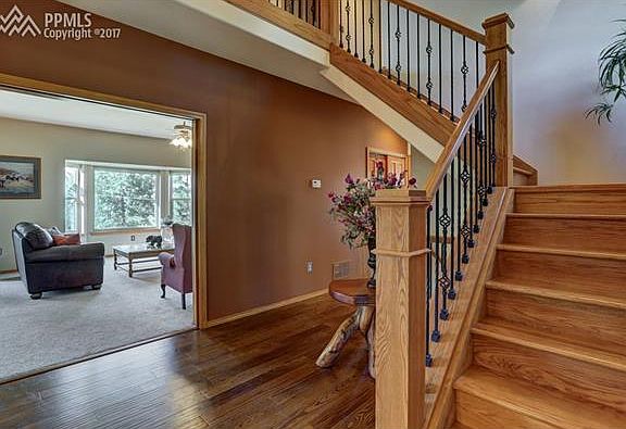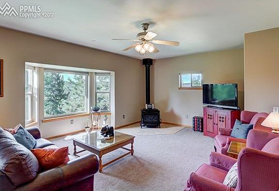 Live on top of the world and in the lap of luxury in this gorgeous custom home. Nicely wooded lot which overlooks the town of Woodland Park and incredible full Pikes Peak views from almost every room in the house. Enter the house to an impressive entry and custom oak staircase with 18 foot ceiling. Then enter a huge great room concept with living, dining, and kitchen all open plus a formal dining room. The house features 2 gas fireplaces and a wood burning stove that will warm your spirits on those frigid days.