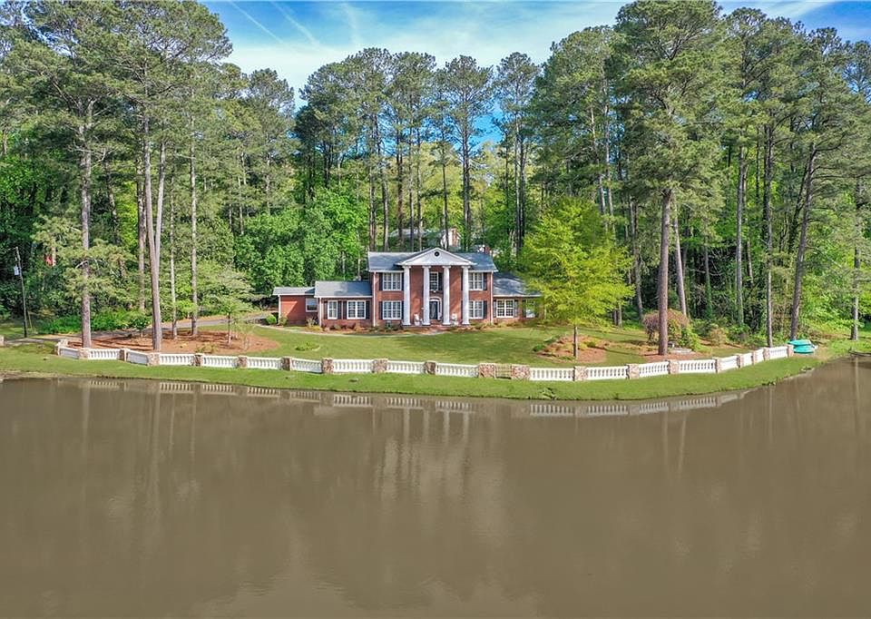 Looking for a unique home that offers character, charm, privacy and is just a quick walk to Canton Street in Roswell? This is it! Gorgeous Southern Manor estate sits on a beautiful lake on 2.6 acres. Remodeled and well maintained, this sprawling brick home is move-in ready. White balustrades lining the lake are from a Historic Chattahoochee River bridge. Covered front porch entry with Historic columns from an 1800s estate leads to a marble foyer with grand staircase. Renovated chef's kitchen features professional 6-burner range, double ovens, farmhouse sink and breakfast nook with lake views and opens to great room with beamed ceilings. Banquet sized dining room with built-ins and decorative fireplace can also be a large living room. Primary suite on main has lake views from every window and includes a marble spa-like bathroom with custom walk-in closet. The cozy sunroom has a wall of windows that overlook the best feature of this property- the beautiful Charleston style stone courtyard with water feature and gorgeous landscaping. It is truly jaw dropping- you won't want to leave this serene, private space! There is also a home theatre and guest wing on the main level with 2 bedrooms & a private bath. This is an awesome space for teens, in-laws, an au pair or guests. Upstairs you will find two large guest rooms both with custom closets & en-suite baths. Private office or playroom also located upstairs. 3 car garage is oversized offering plenty of room for a workshop & more. Walk-in basement storage room is easy to access. Fishing in your front yard, coffee or wine in the courtyard, plus so much quiet and privacy you will feel like you're on vacation every day of the year. The location is fantastic- less than a 1 mile walk to restaurants & shops on Canton Street.